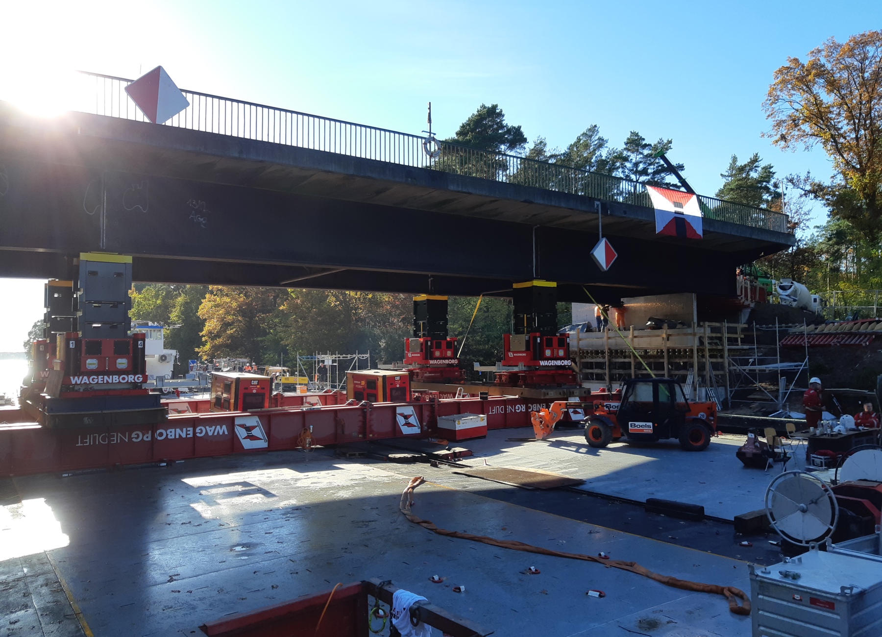 For the relocation operation, the Wagenborg Nedlift team deployed a combination of techniques. First, a set of coupling pontoons with support beams on top. This created a stable surface for the jacking system that had to lift the bridge from the abutments.