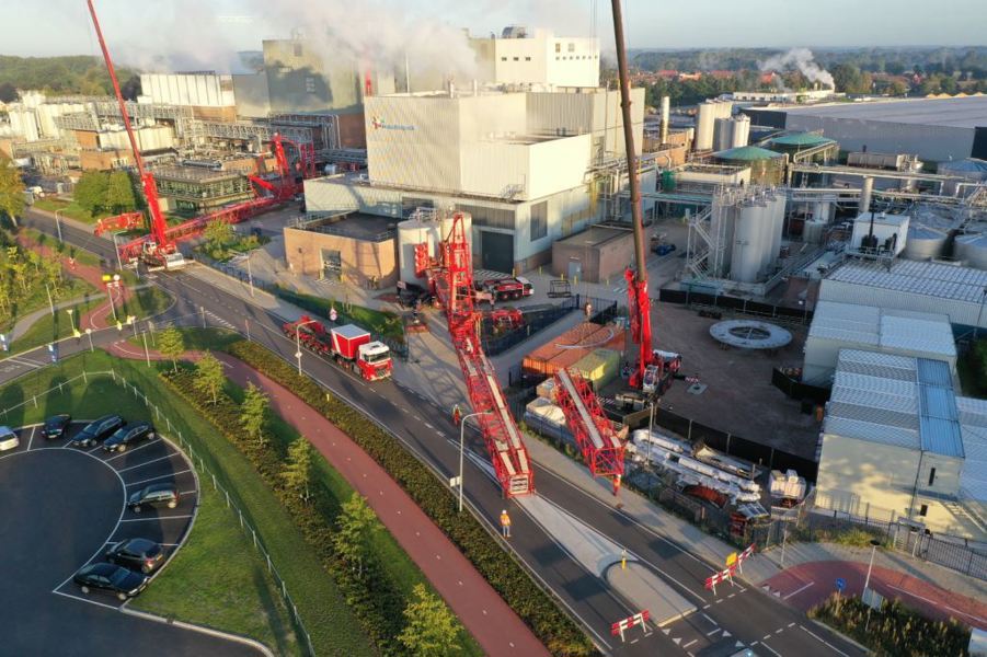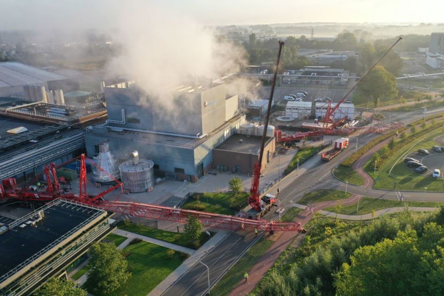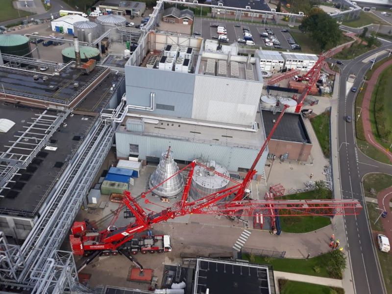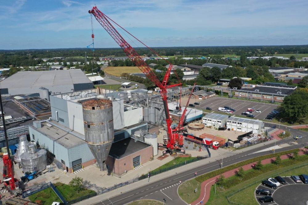 Using a 700-tonne mobile crane with luffing jib and guying jib, the tower was lifted from its foundation. In the air, the tower was taken over by a 500-tonne mobile crane (also fitted with a luffing jib) with the aid of a lifting beam. Together with an 80-tonne mobile crane, the tower was lifted and positioned on the lay-down. Ready to be scrapped. An impressive piece of craftsmanship!