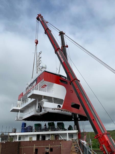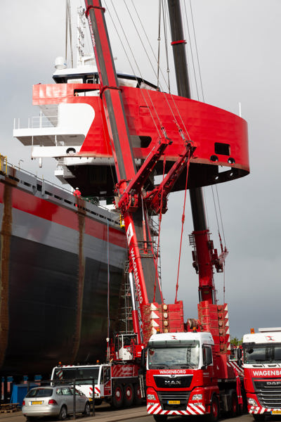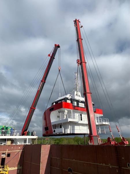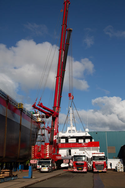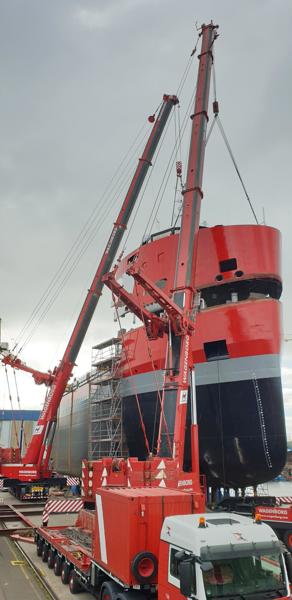 The bridge deck, weighing 145 tons, was positioned by a 700 and 500 tons mobile crane. A spectacular tandem lift, which was completed around noontime. All operations were finished successfully. Result? A satisfied customer.