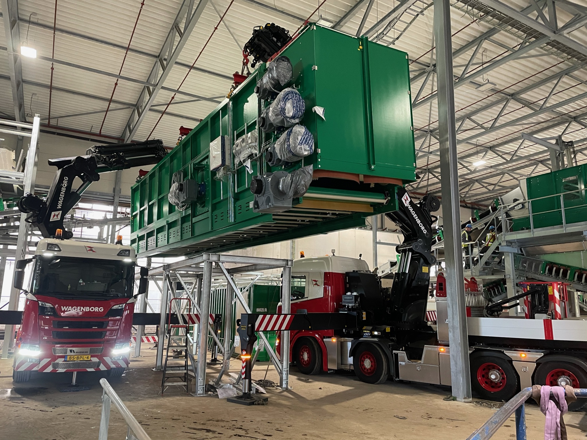 The new composting plant is assembled by module by the waste processing technology specialists from Banzo Engineering in Hoogeveen. The Wagenborg Nedlift team was responsible for the installation of the modules. Quite a challenge, as the components had to be placed between the existing steel constructions inside the composting building. The lifting height inside the building was limited, as was the available installation space for cranes!