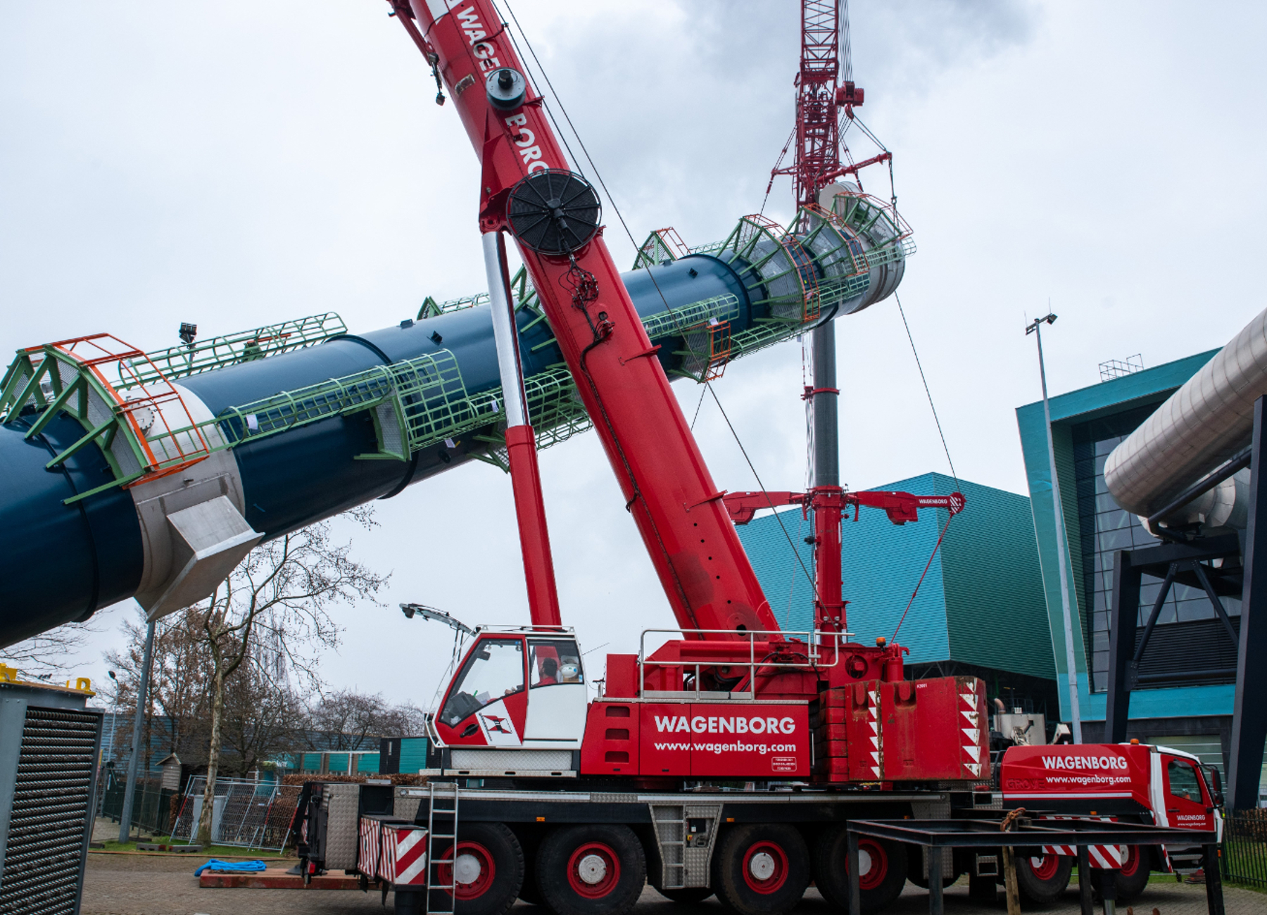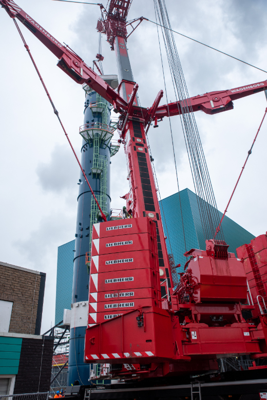 For this lifting operation, the 'grande dame' from Wagenborg Nedlift's fleet was mobilised: the 700-tonne Liebherr mobile crane. The 300-tonne crane assisted in tilting the columns from horizontal to vertical position and transport to below the crane hook was carried out with SPMTs.
