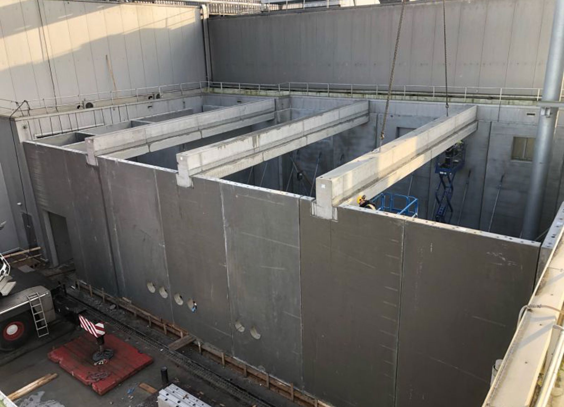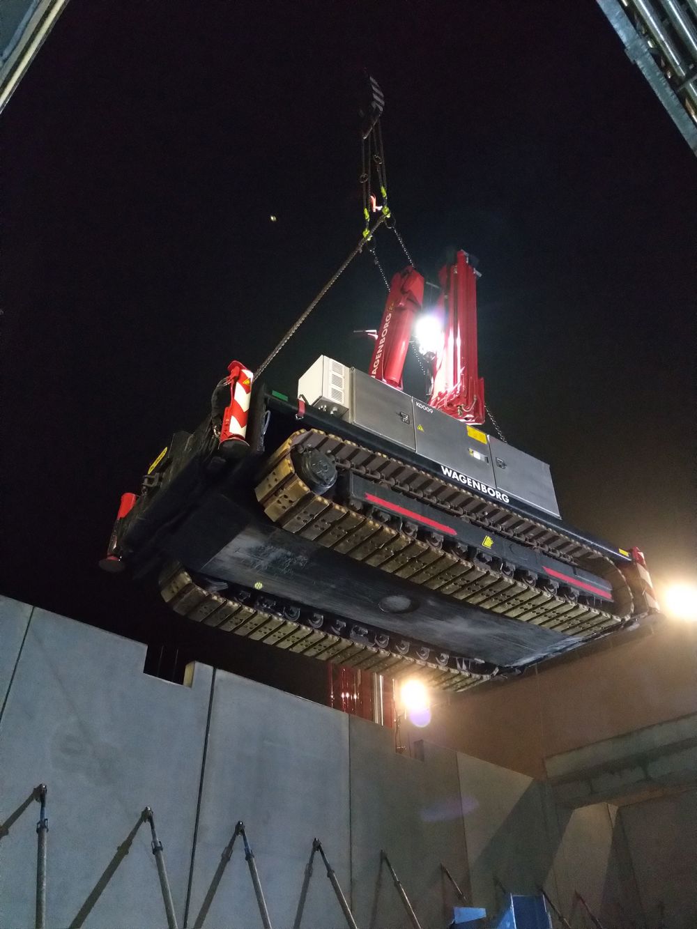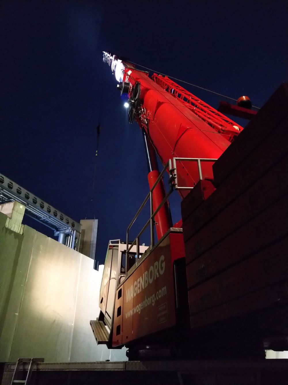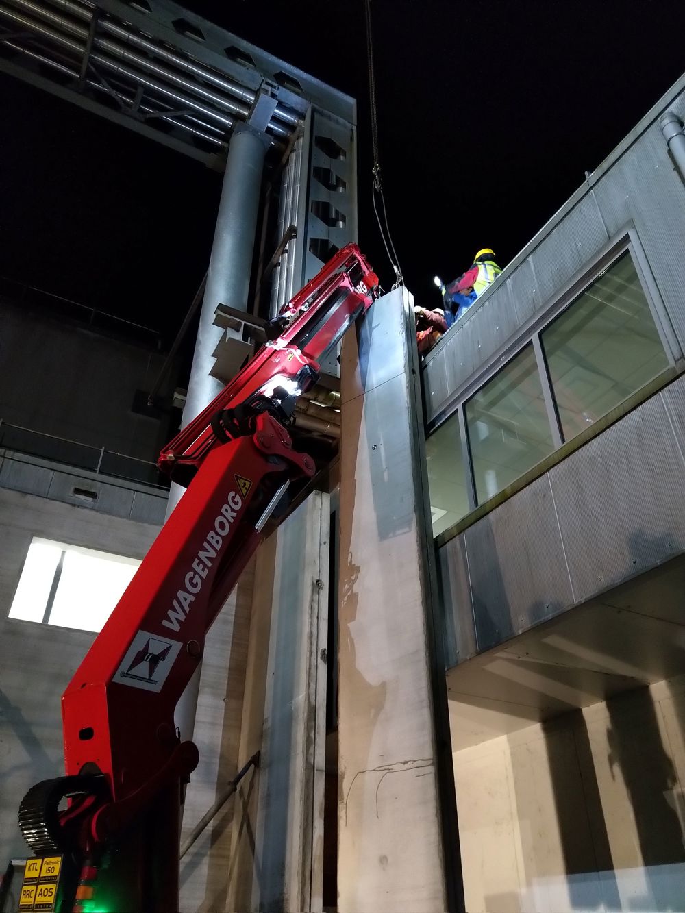 It was possible to place many of the walls (each one weighing up to 12 tonnes) on the foundation using the 300-tonne mobile crane, which was set up outside the building. However, it was not possible to install the walls under the pipe bridges in this way. So the Wagenborg Nedlift team came up with an inventive solution that utilised the Palfinger mini crane.