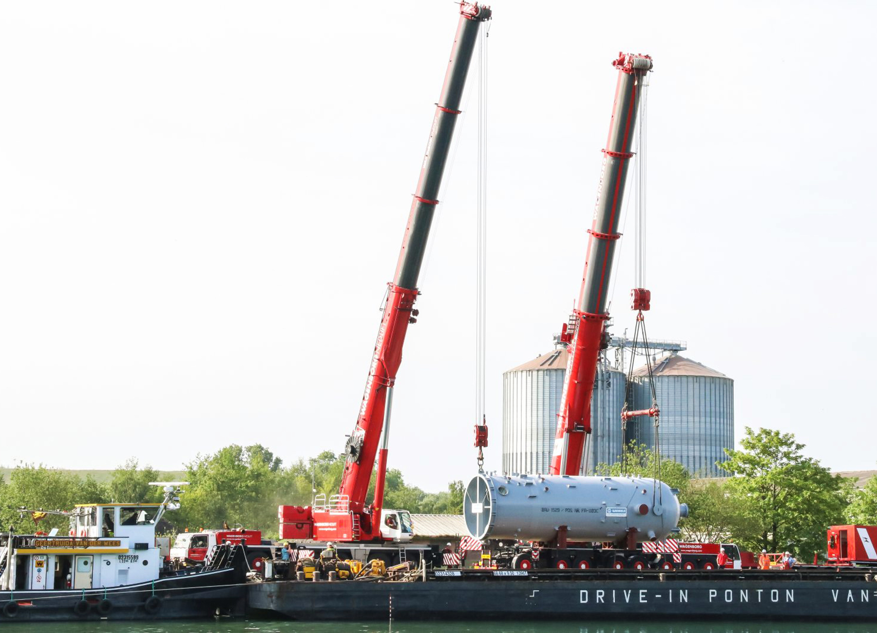 The pressure vessel, measuring 12,8 meters long, was first transported by modular trailers. Hereafter, it was loaded onto a drive-in pontoon by a RoRo-operation. After water transport, a 400- and 500-tons mobile crane lifted the enormous pressure vessel from pontoon and positioned it upon modular trailers again. An impressive tandem lift! After transshipment, the last part of the journey to the final destination could begin.