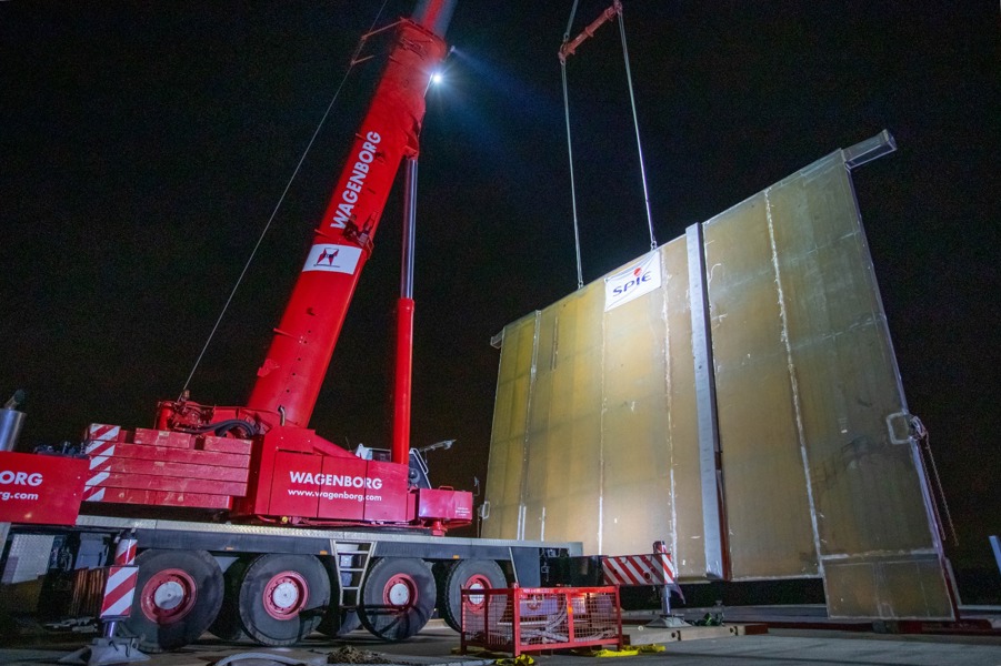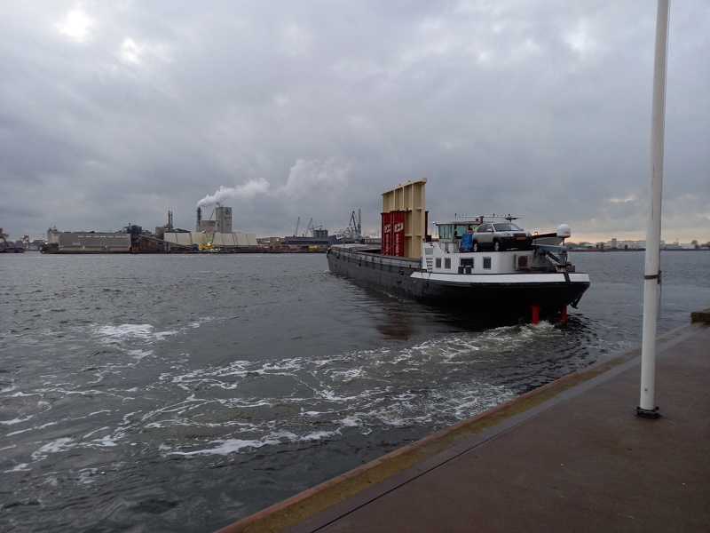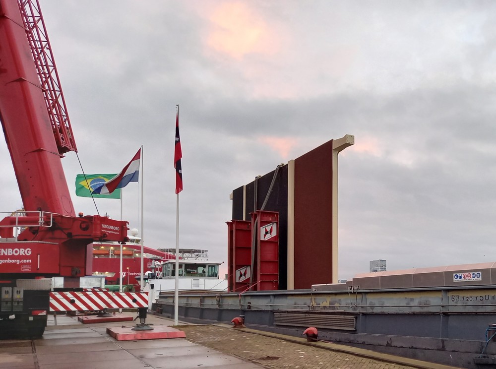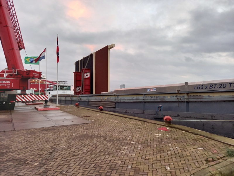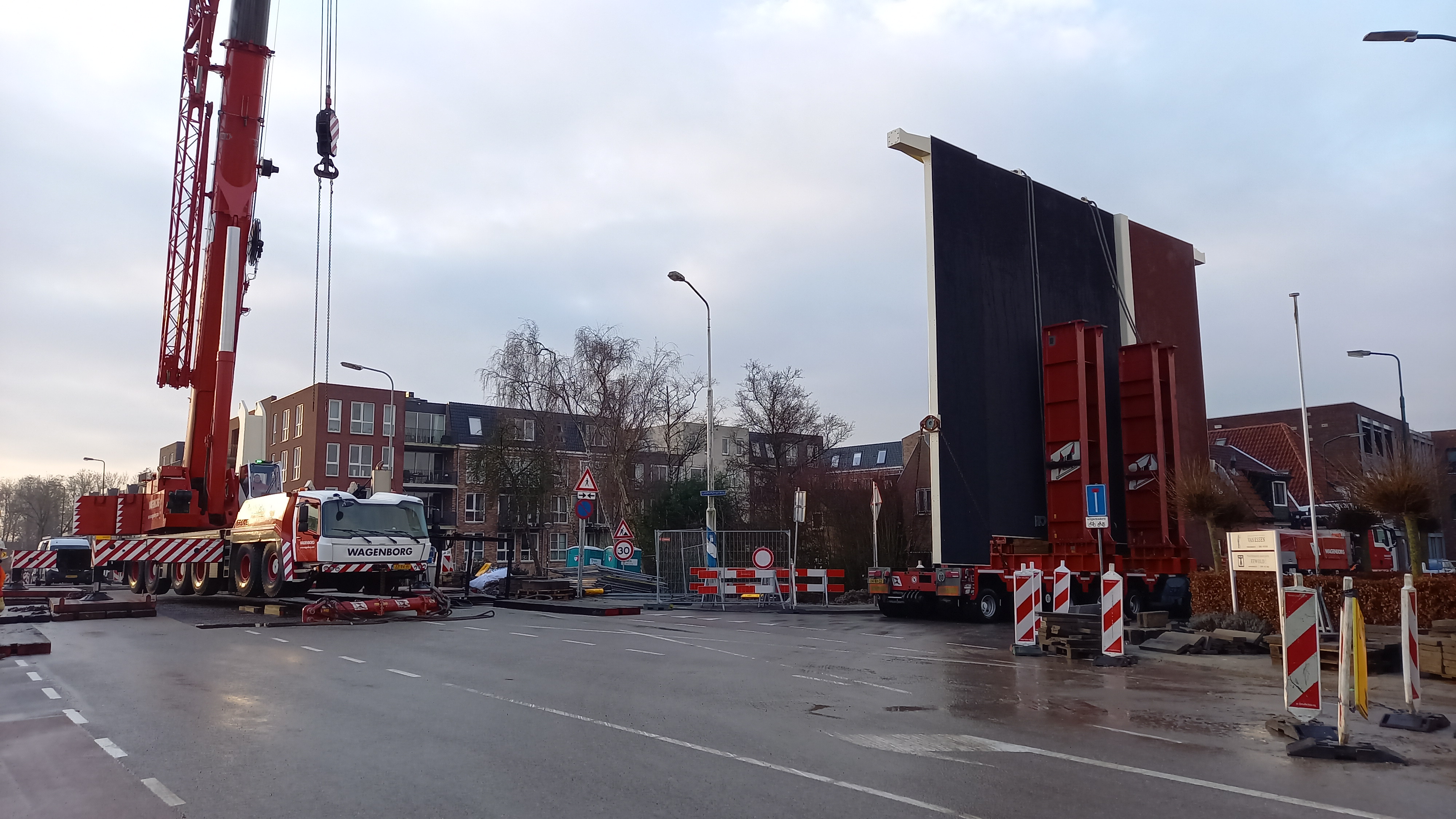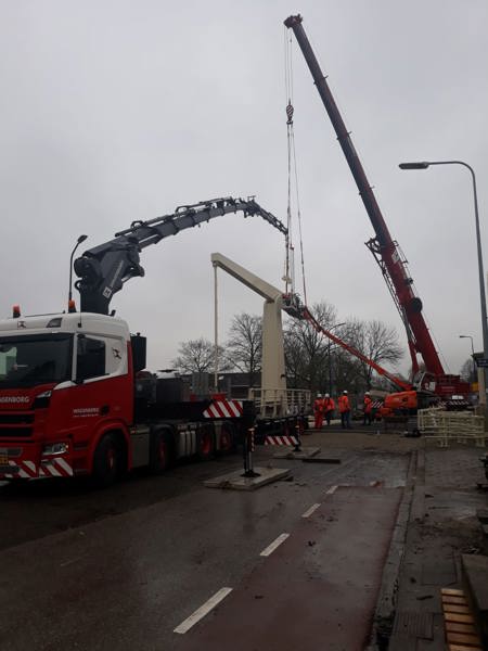 This was the start of a ‘round-the-world journey’. From the production site located in Wijhe in Overijssel, the bridge deck was transported upright to the quayside. From the quayside, it was transferred to a pontoon headed towards Amsterdam, where the deck was stored temporarily. The bridge deck was picked up in Amsterdam once it was ready to be moved again. It was then transported, still upright, to Bodegraven by inland vessel via the Fixed Mast route. Here the deck was offloaded and transported in a vertical position by road to the Kwakel Bridge location in Woerden, where a mobile telescopic crane lifted it into place.