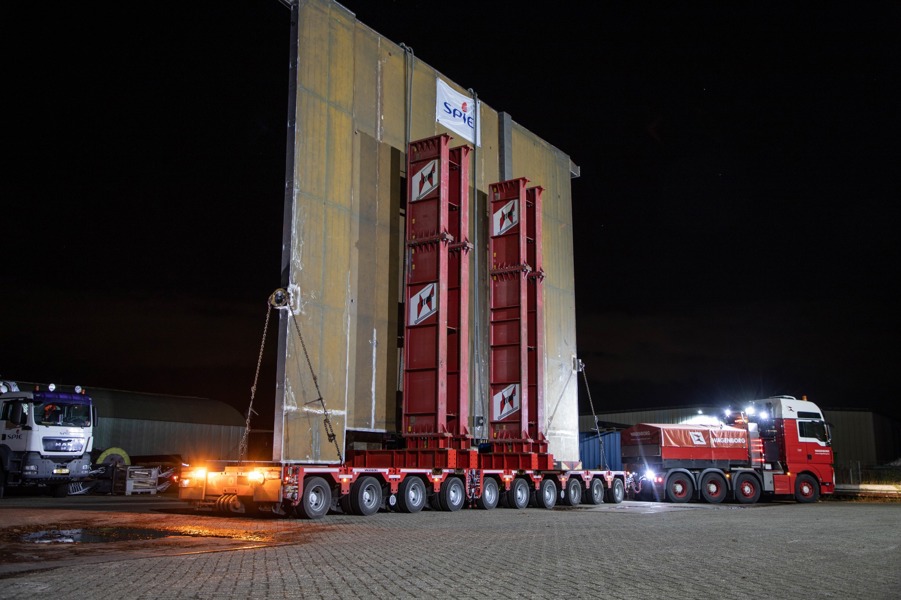 Transporting an 11-metre-high bridge deck upright posed quite a lot of technical challenges. Heavy support beams were mounted on the trailer to secure the deck in its vertical position during transport, so that it was held safely in place between them.