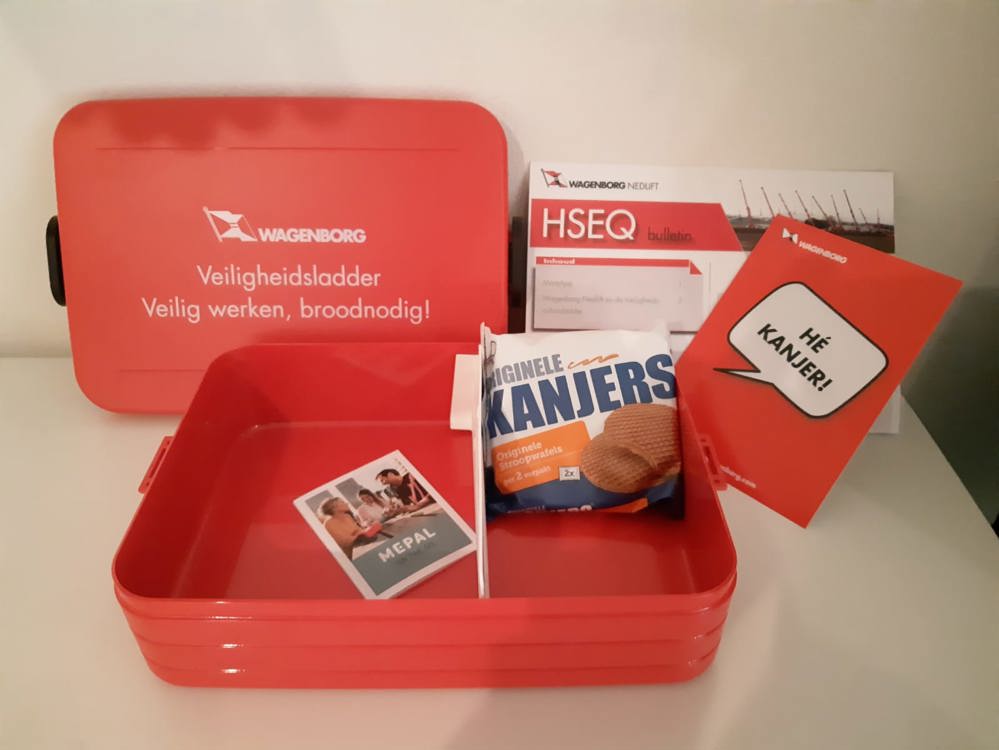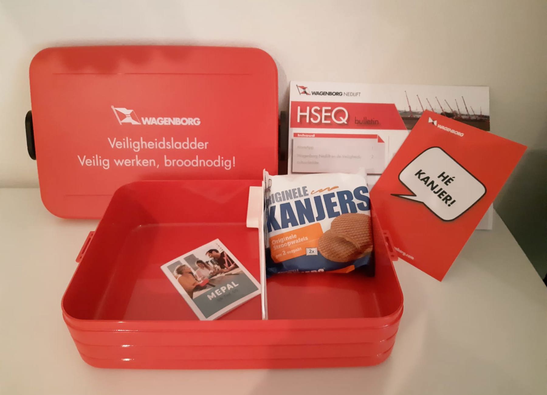 All of Wagenborg Nedlift’s operational employees receive a filled lunch box with the text ‘Veilig werken, broodnodig!’ (Safety at work – it’s vital!). Bertwill Mulder (HSEQ manager) and his colleague Jeffrey Poort are personally handing the lunch boxes out at the work sites. They immediately start a conversation with the employees about safety when they do so.