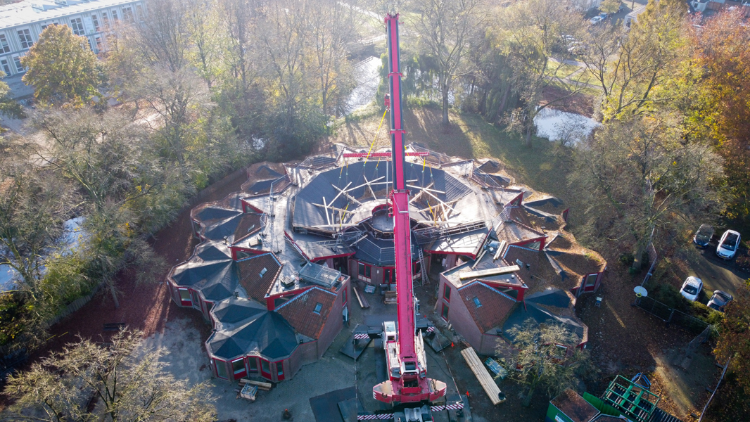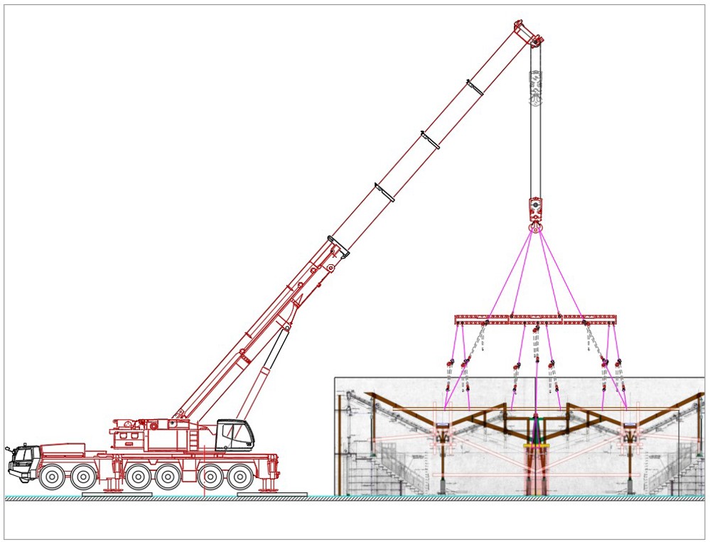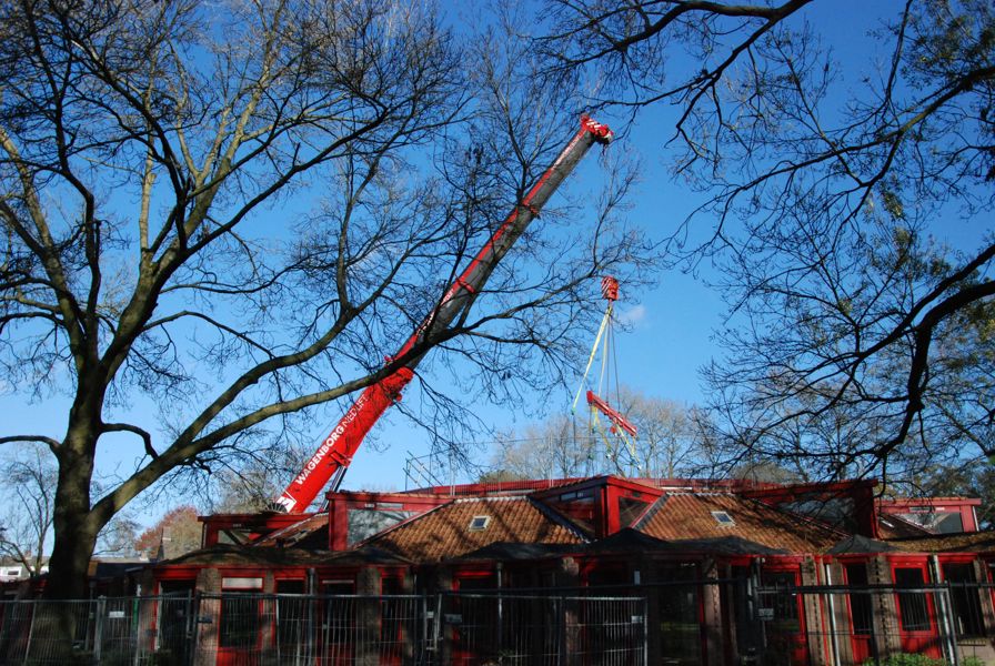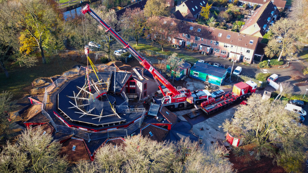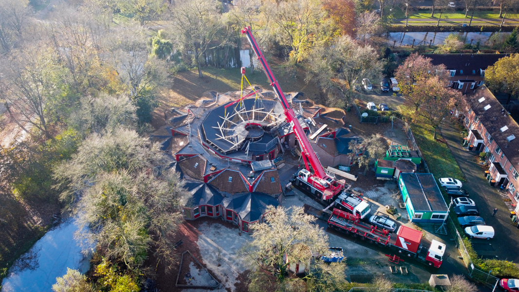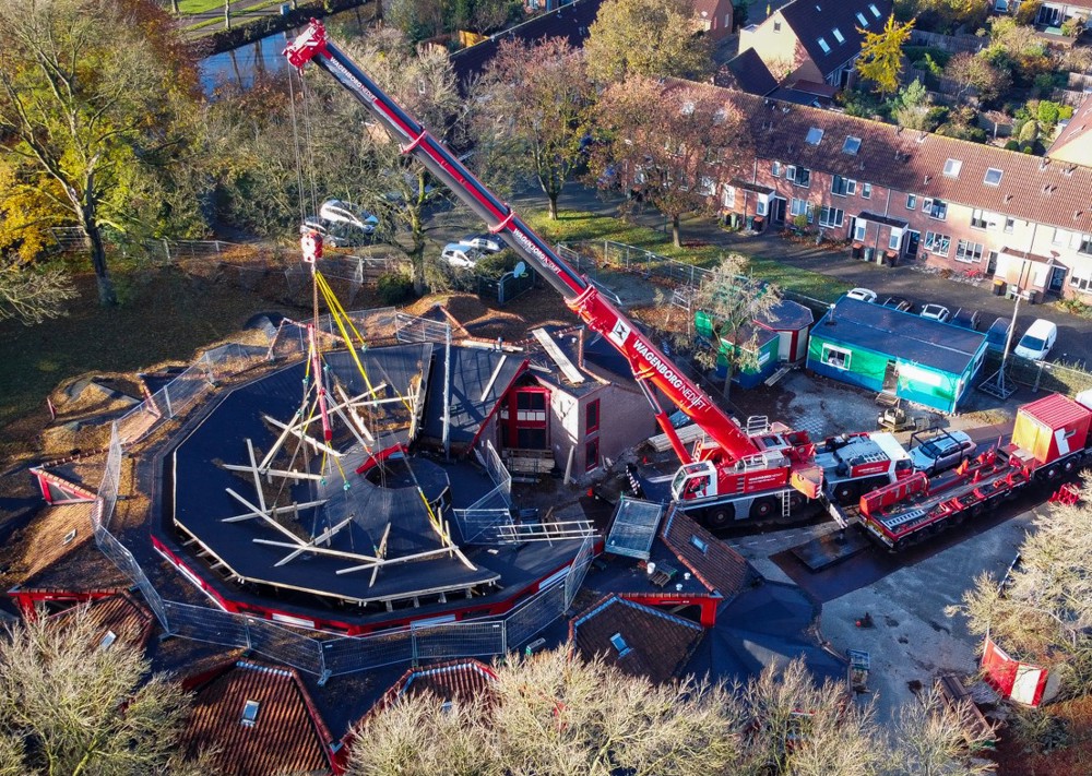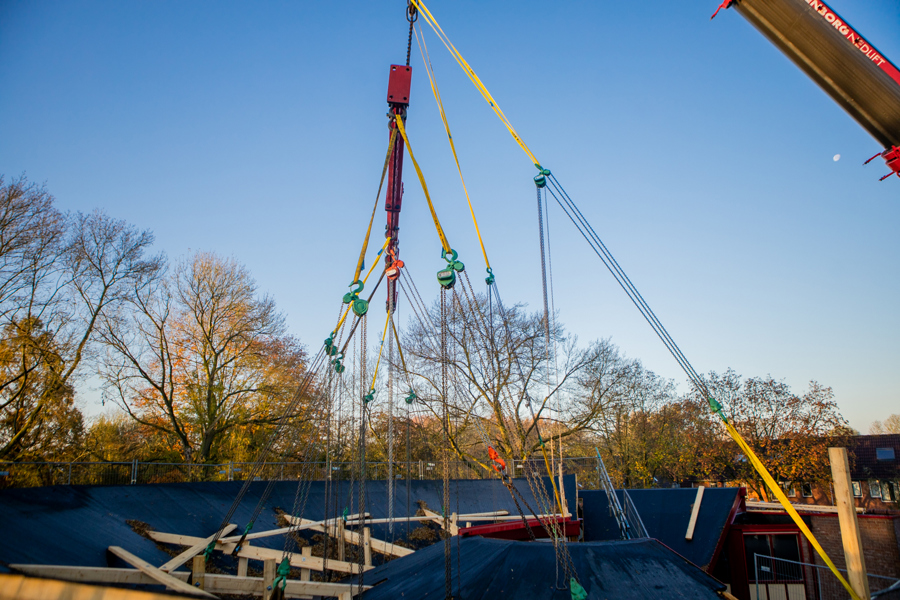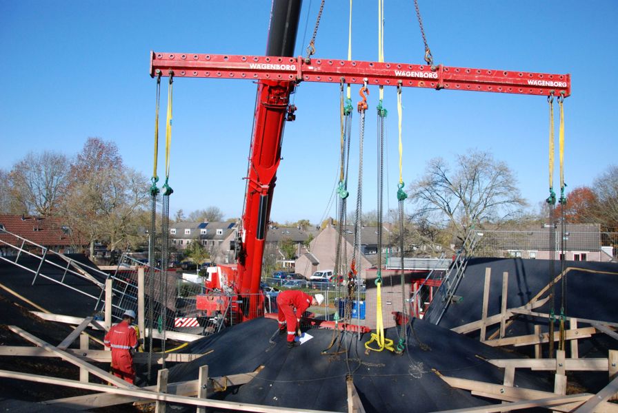 An action plan was established, in close collaboration with the construction specialists of Jansman Bouw. First, Jansman reinforced the roof with wooden reinforcement constructions. Meanwhile, the Wagenborg Nedlift team focused on the lifting method. Due to its unique design, the plan involved lifting the roof at 9 lifting points, to ensure the forces in the roof were always and well under control.
