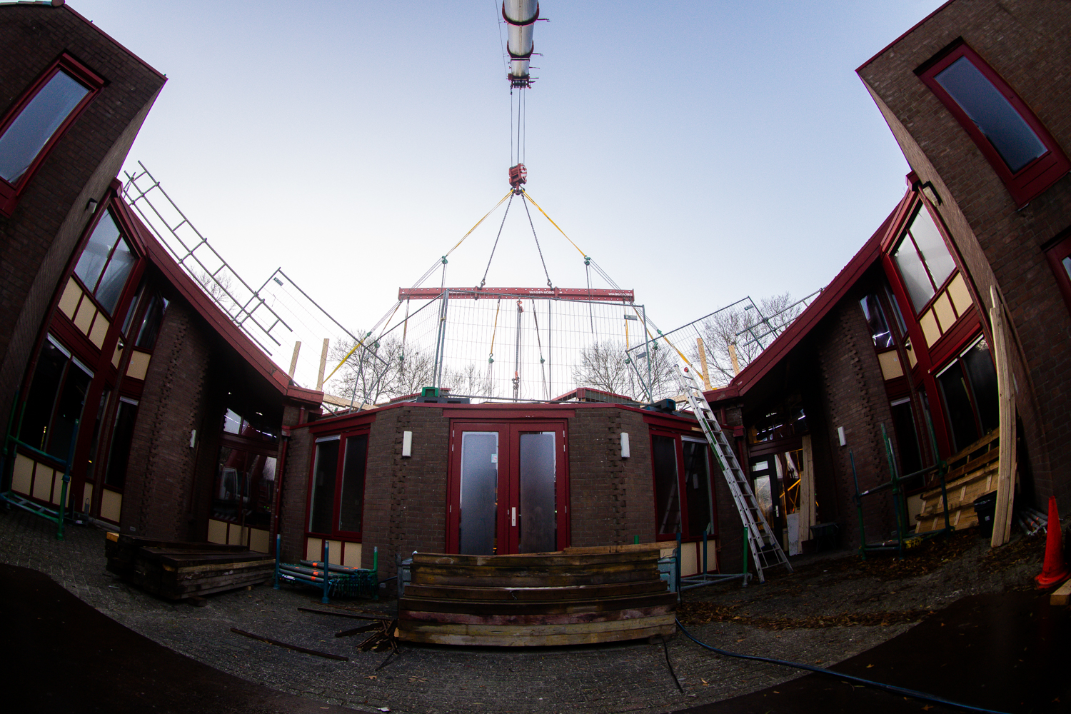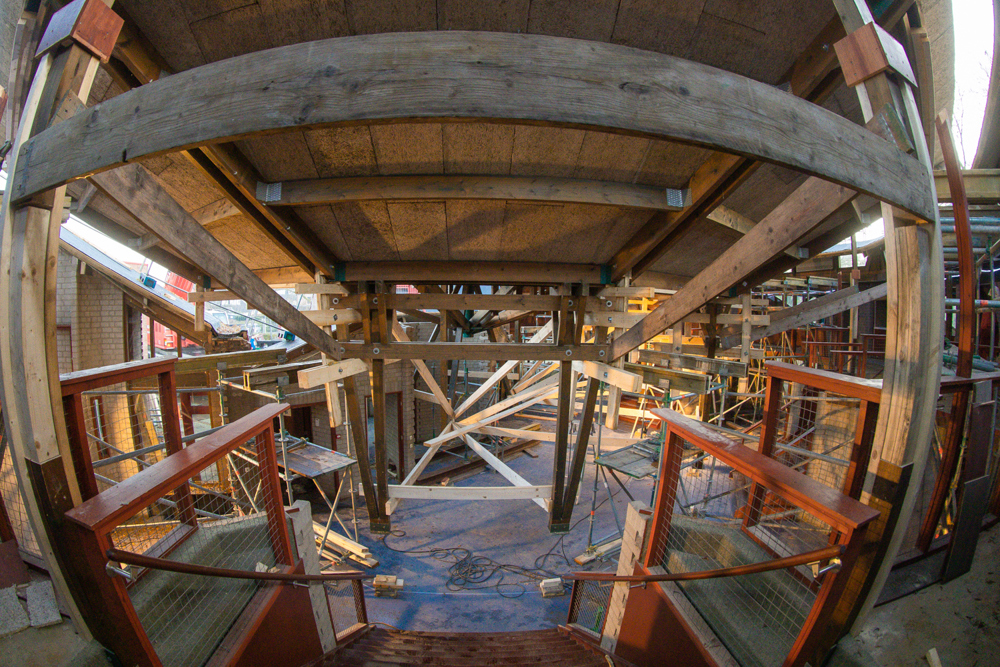 The idea behind increasing the height of the central space was ‘taking the roof off’ by lifting the wooden roof construction. This way, a support structure could be established, after which the roof could be placed at the new height.
