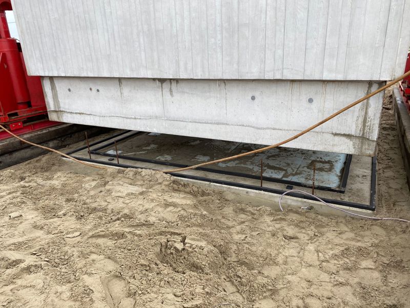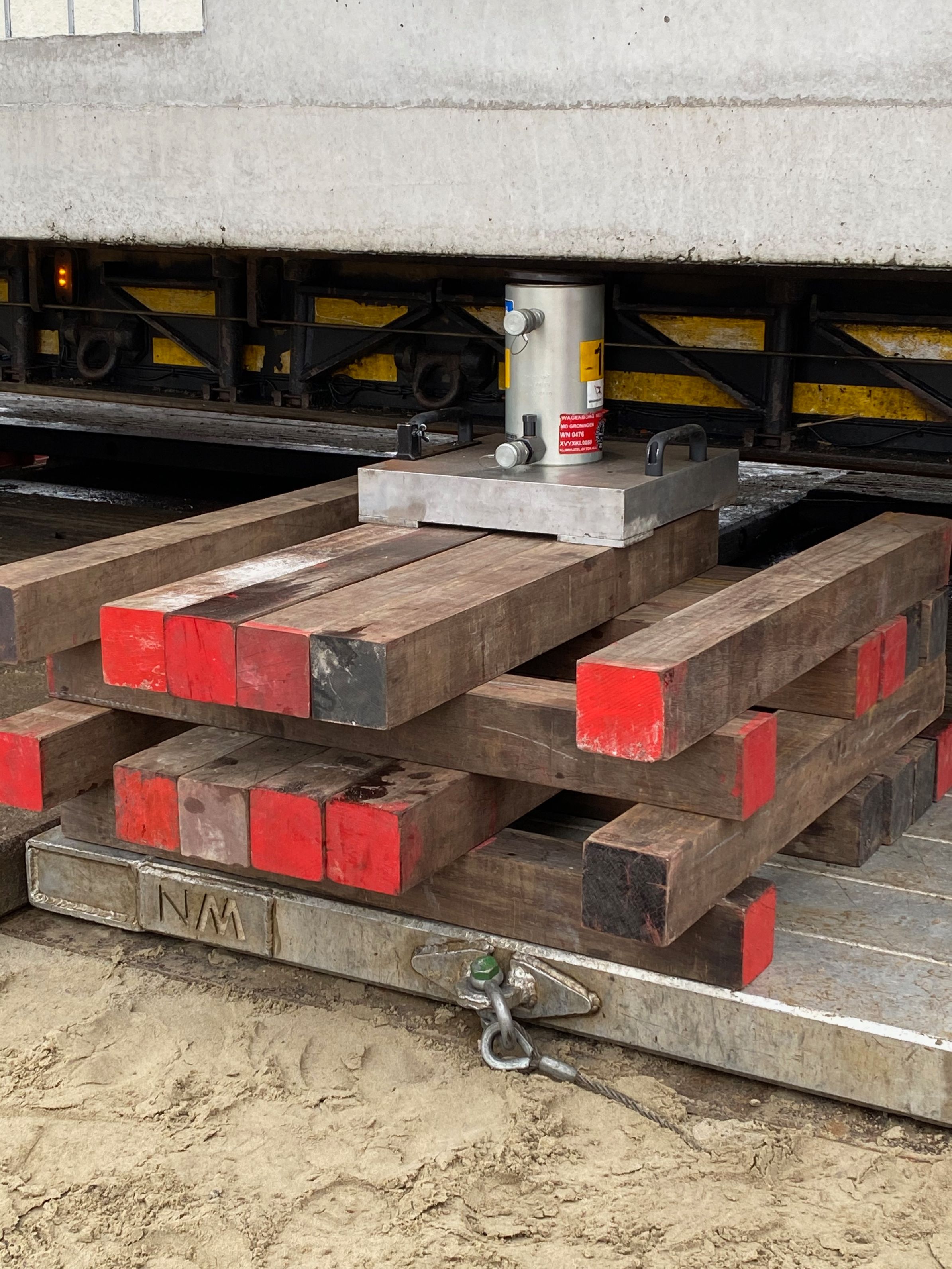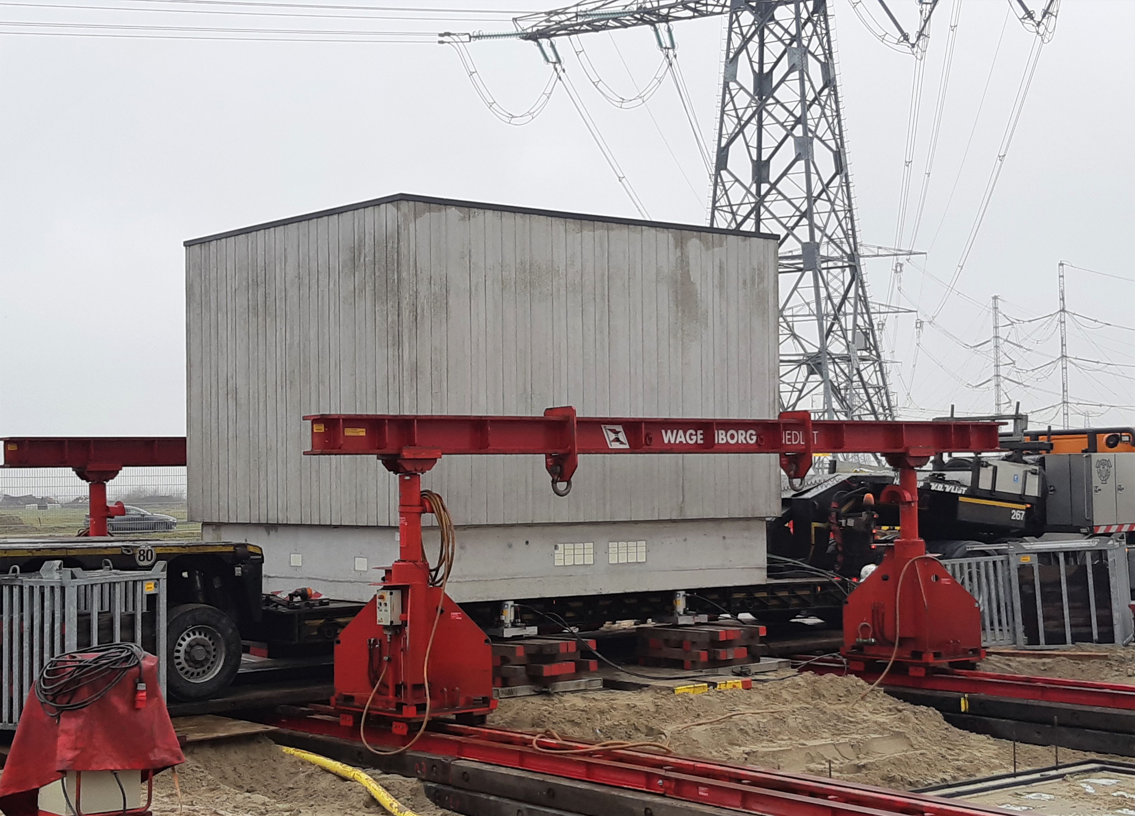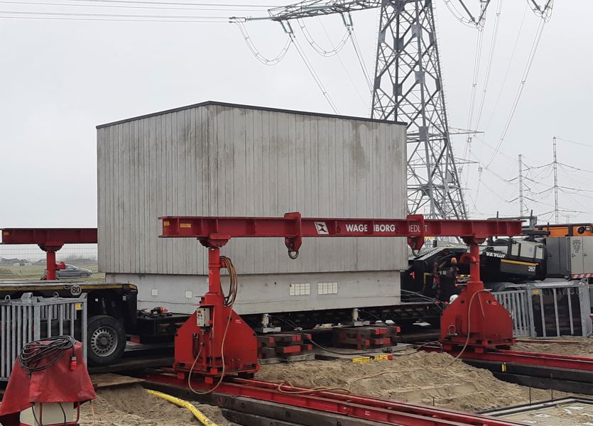 Fortunately, the lifting and transport specialists from Wagenborg Nedlift are extremely resourceful. They came up with a solution using skidding and jacking technology and a lifting gantry to get the job done. The low loader carrying the cabin was driven next to the foundation.