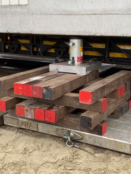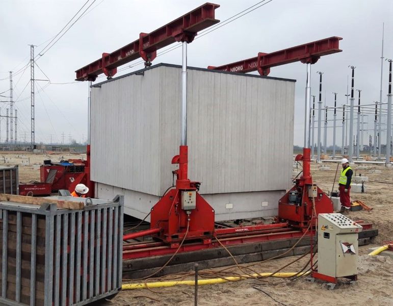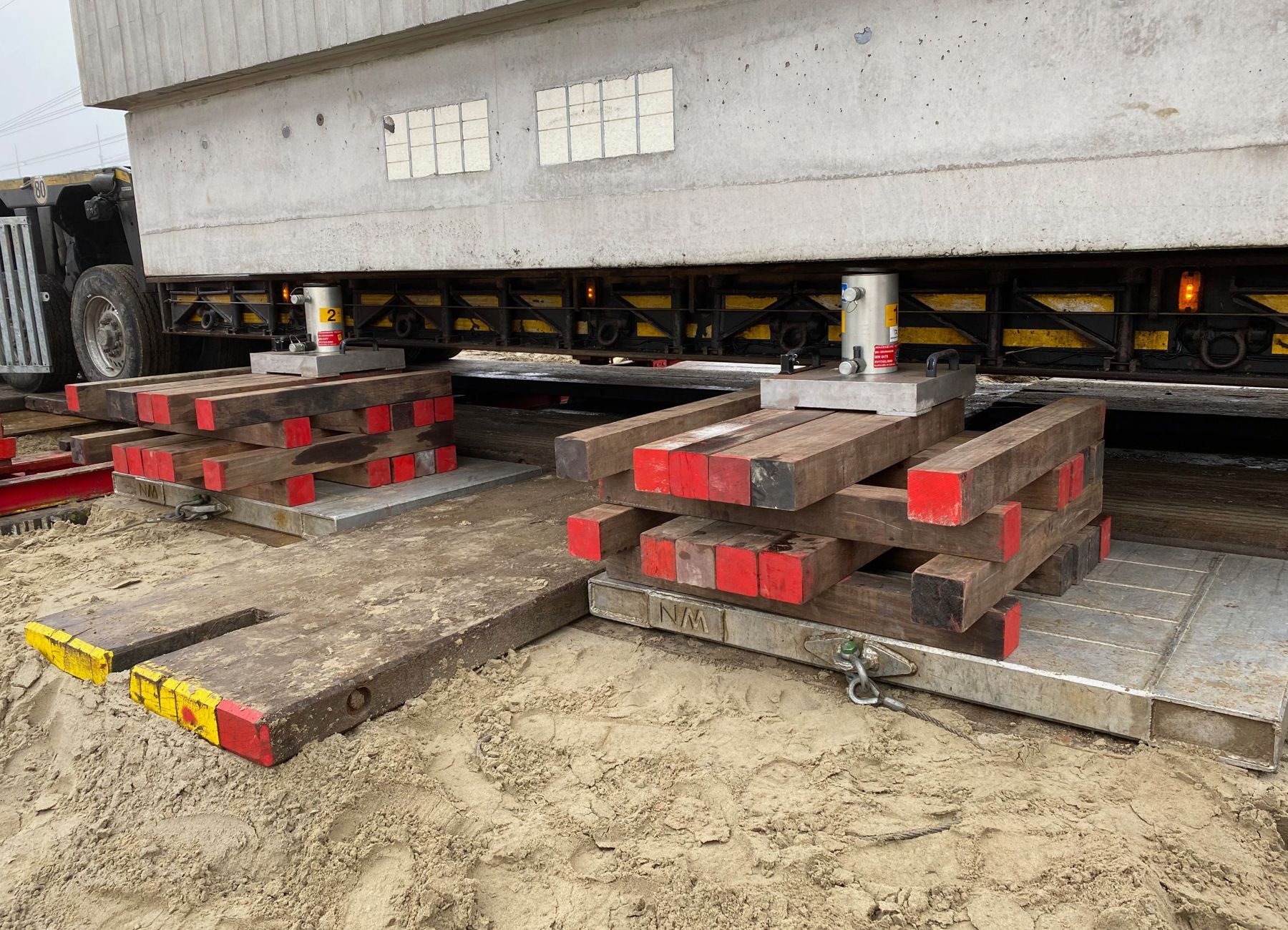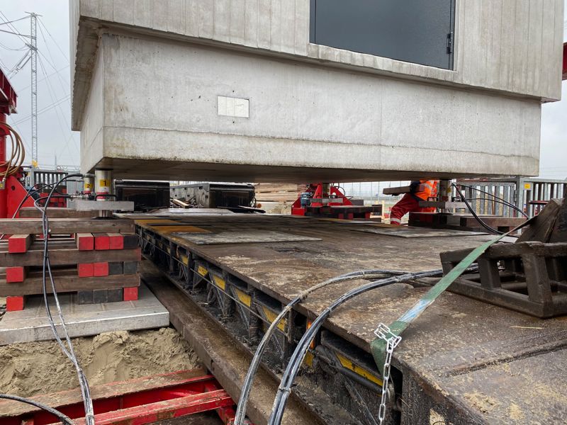 Using climbing jacks, the cabin was raised so that the low loader could be moved away, after which it was once again lowered to the height at which the lifting gantry could take over the cabin. From there it went slowly sideways towards the foundation. When it arrived at the right position, the cabin was placed onto the foundation with millimetre precision.