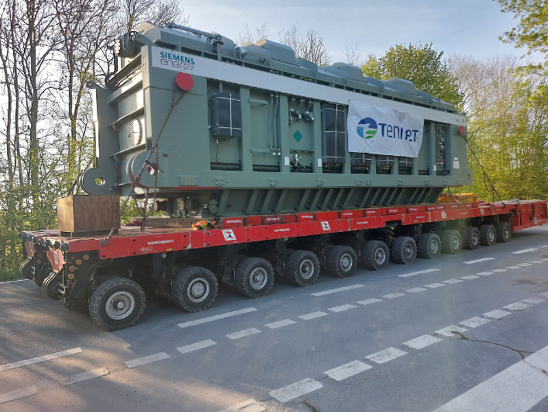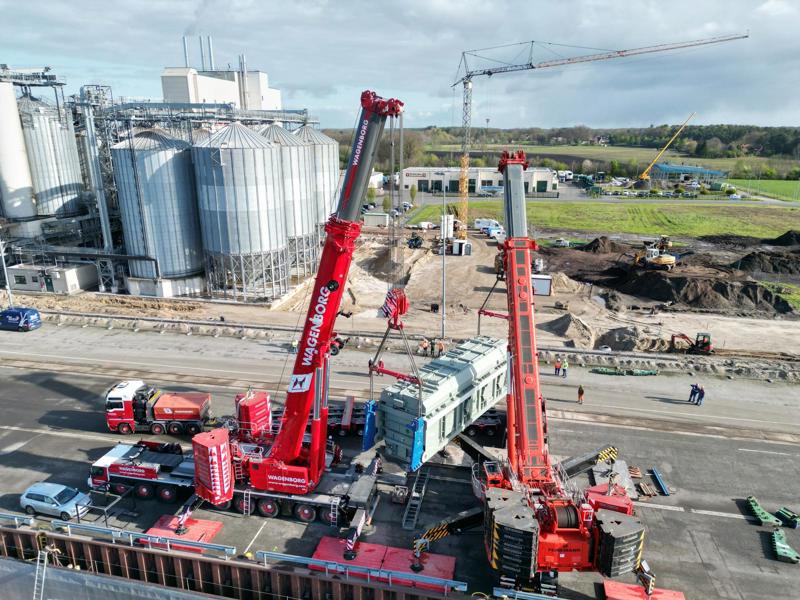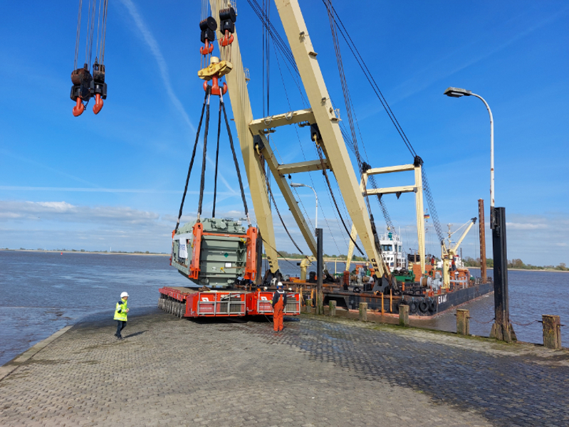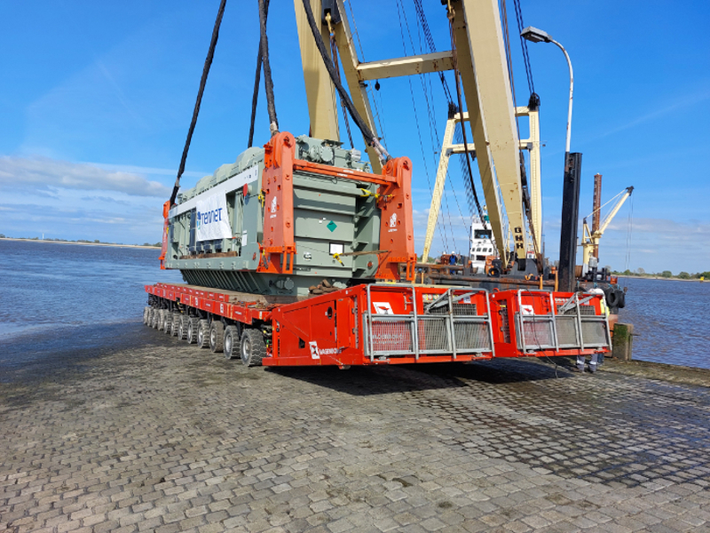 In northern Germany, the team was called into action to transport a transformer weighing no less than 395 tonnes to its final destination. Using the 'Enak', a large sheerleg, this giant was loaded onto SPMTs at the ferry quay in Kleinensiel. The transport combination then 'only' had to climb a steep 9% incline to get to the top of the dike. Not an easy feat for equipment and operator!