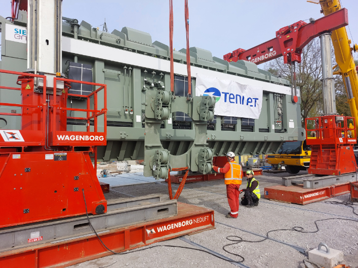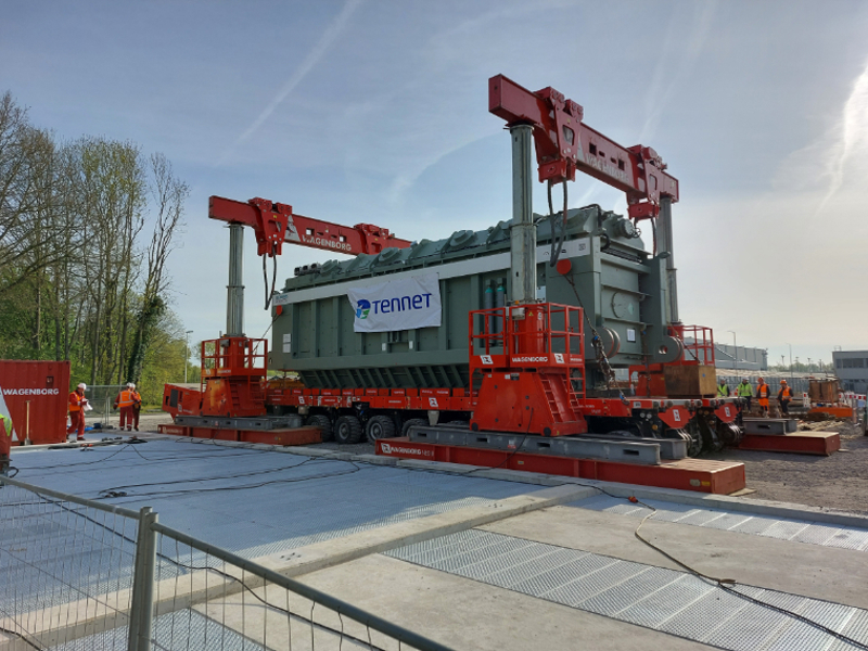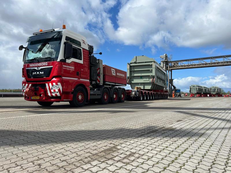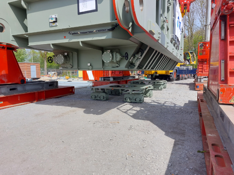 The transformers then travel to their final destination by train. This is achieved by using a special two-part heavy-duty train frame, with the transformer suspended between the two sections. For this purpose, Wagenborg Nedlift's team prepares each transformer on the track with a jacking operation. Over the next few weeks, the special rail vehicle will transport the transformers one by one to their destination. Multimodal transport at its best!