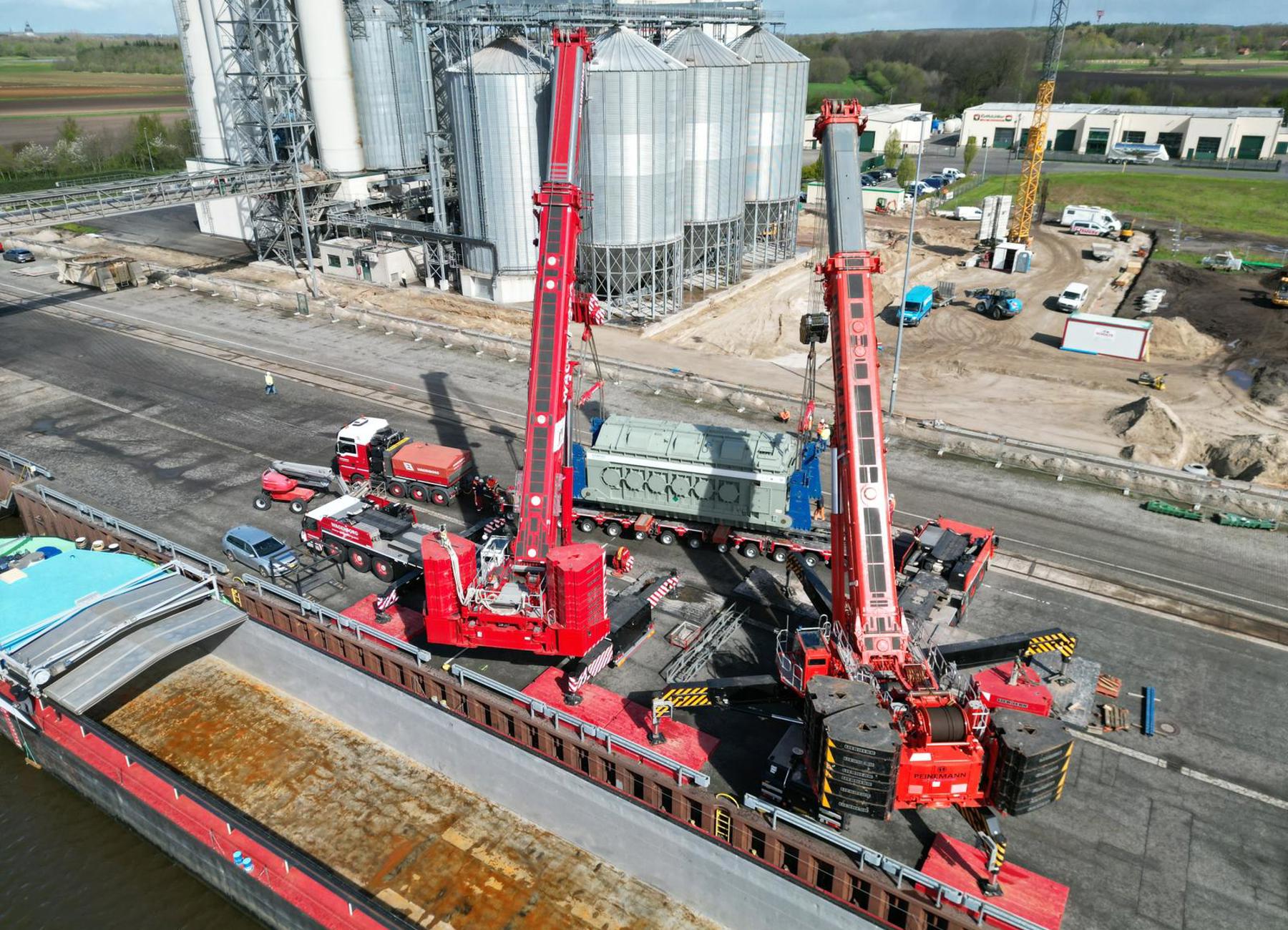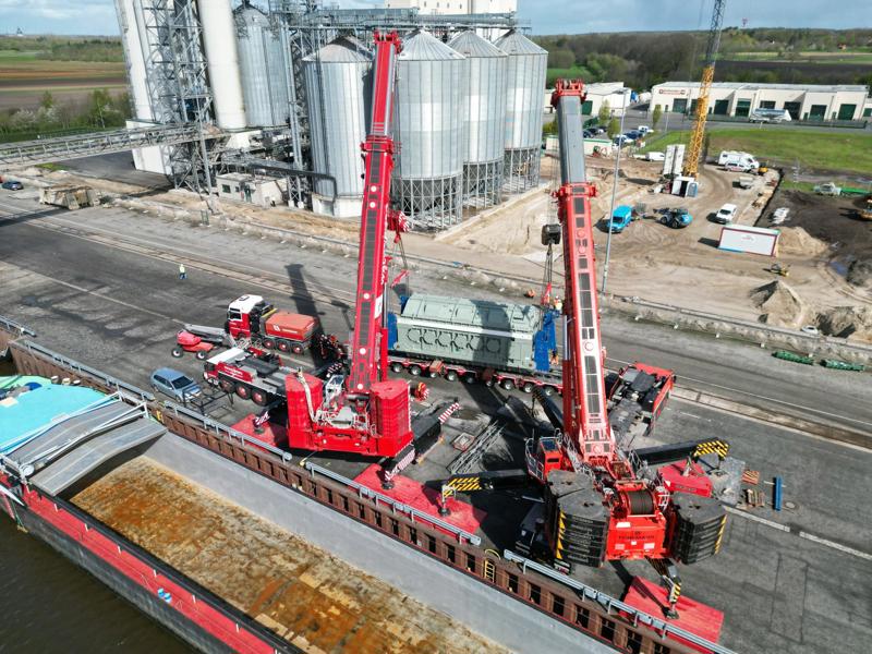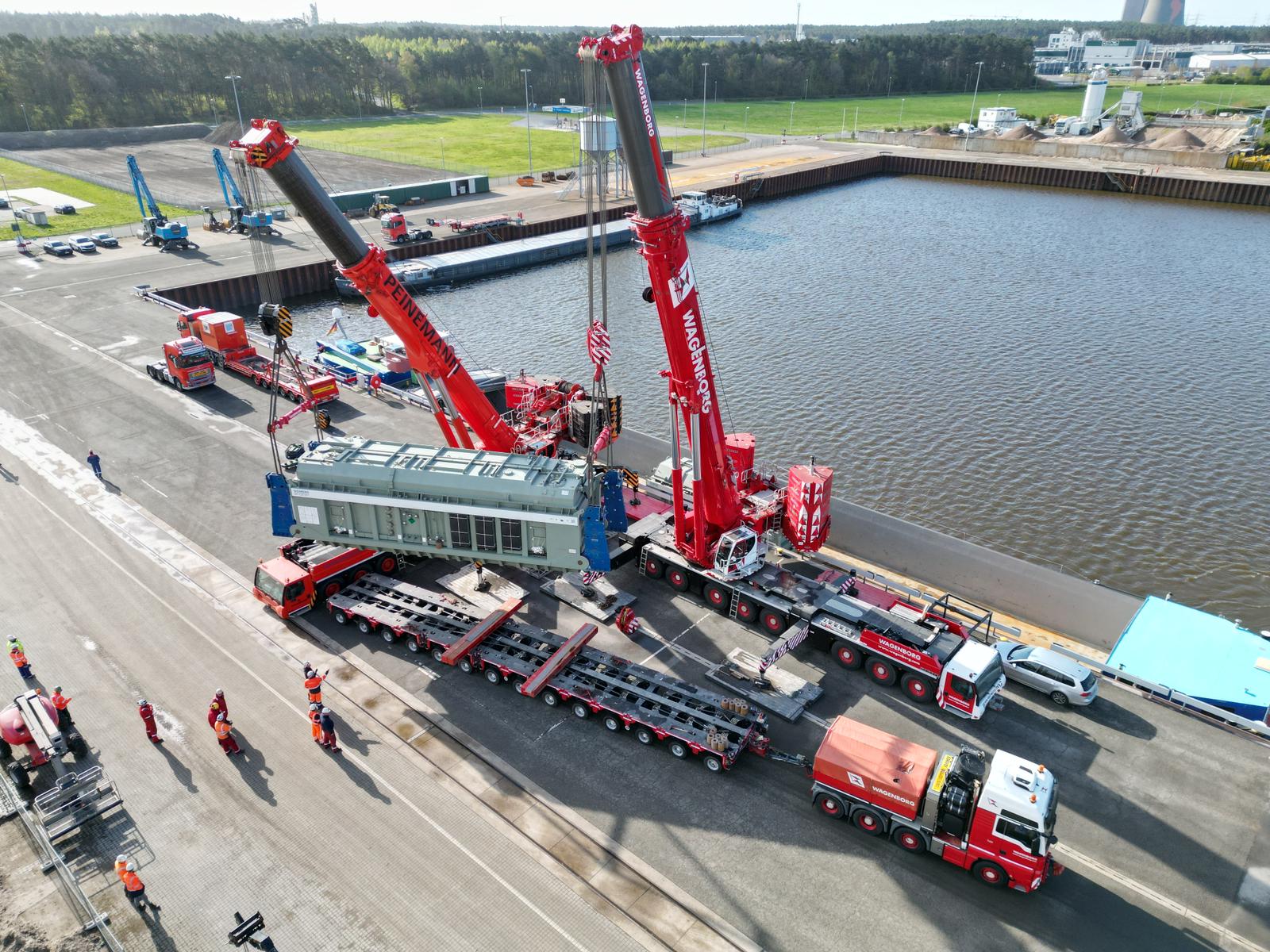 Over 100 kilometres away, two large mobile cranes were used to unload a series of six transformers, each weighing 320 tonnes, from the barge. Each transformer was loaded onto a 14-axle conventional trailer via a tandem lift by the 700 and 800 tonne Liebherr powerhouses. The transport combination then temporarily 'parked' the transformer a short distance away.