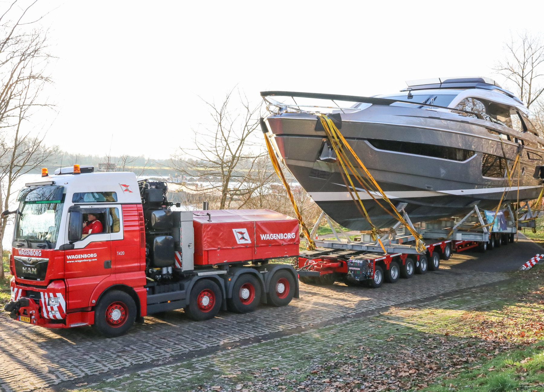 In Dordrecht we drove the (still) empty trailers onto a pontoon, followed by the water transport to Rotterdam. Here we loaded the yachts from a seagoing vessel onto the trailers on the pontoon. After this we sailed all the way to Düsseldorf, where the RoRo (roll-on/roll-off) took place and where the yachts entered the hall.