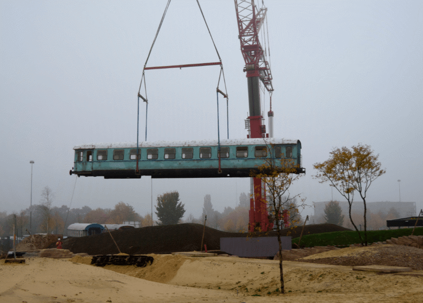 Een bijzondere uitdaging was het transport en plaatsen van vier oude treinwagons uit het Duitse Großauheim Hanau. Met behulp van een 200 tons mobiele telescoopkraan zijn de wagons eerst van hun onderstellen gehesen, waarna alle uitstekende delen onder de wagons verwijderd konden worden (luchtketels, opstapjes, verbindingspennen etc.). Daarna konden de wagons op de vrachtwagens geladen worden en konden de combinaties van maximaal 29 meter lang, 3.30 meter breed en 4,30 meter hoog onder particuliere begeleiding beginnen aan hun reis naar Nederland.