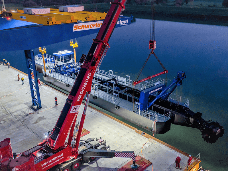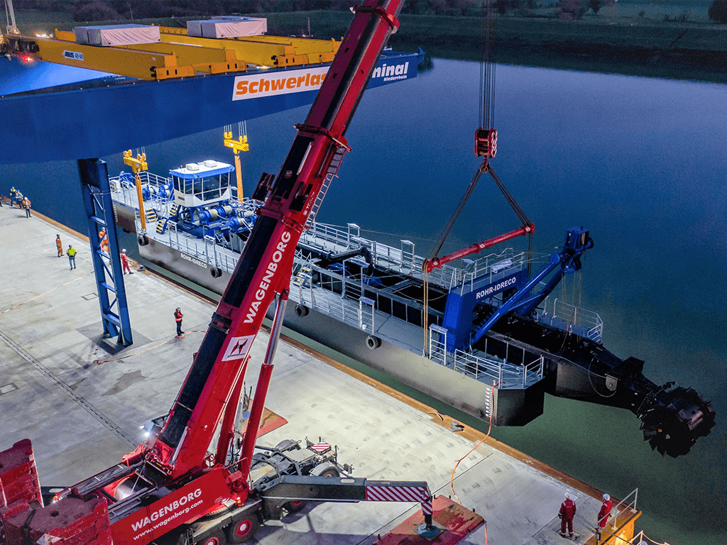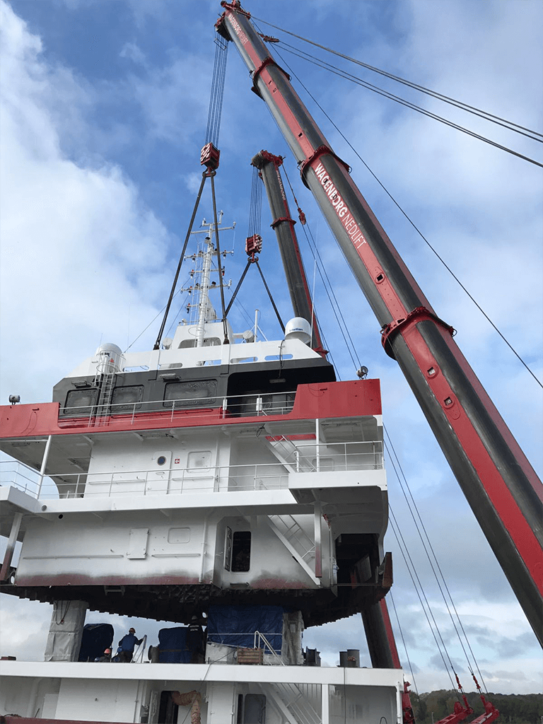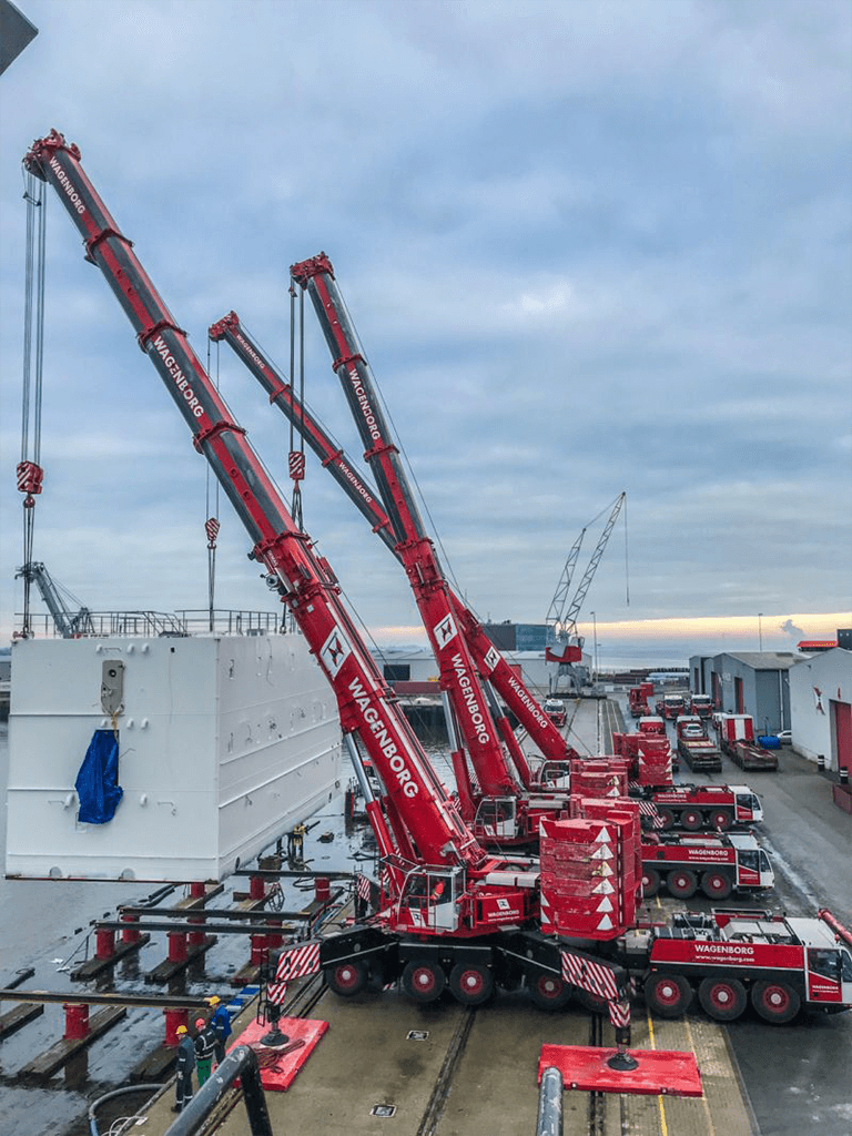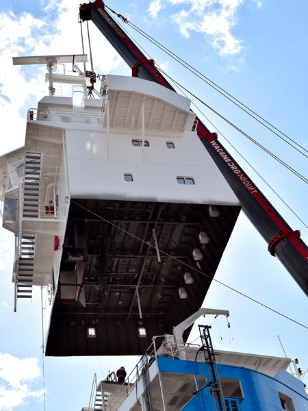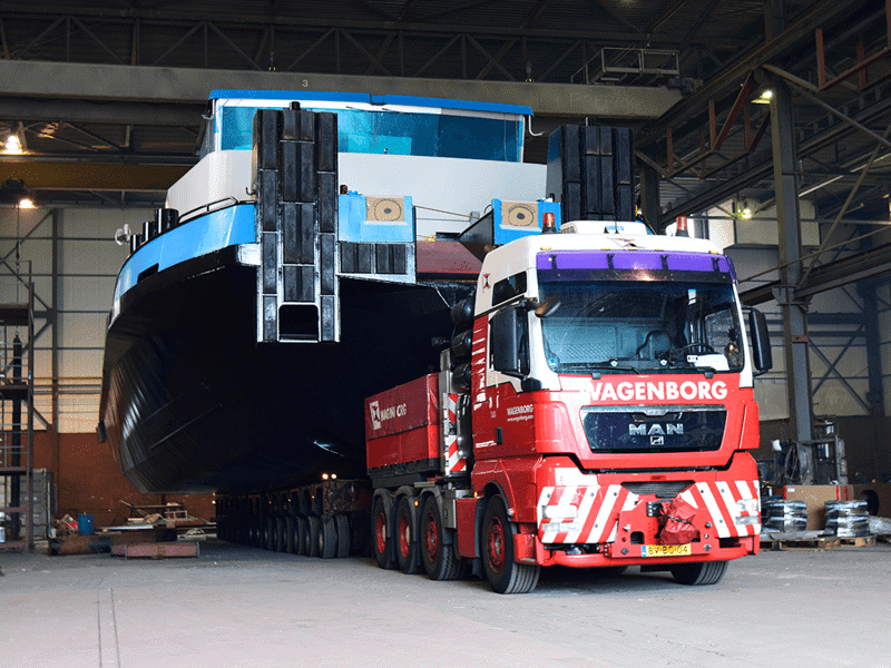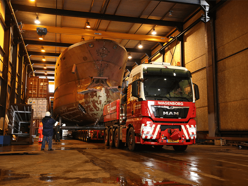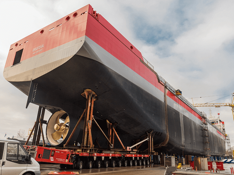 Scheepsbouwprojecten kennen vaak bijzondere uitdagingen in zwaar transport en hijswerk. Want hoe kan een scheepssectie van een paar honderd ton worden verplaatst of gekanteld? Of een schroefas veilig worden uitgewisseld bij een schip dat op de helling ligt?