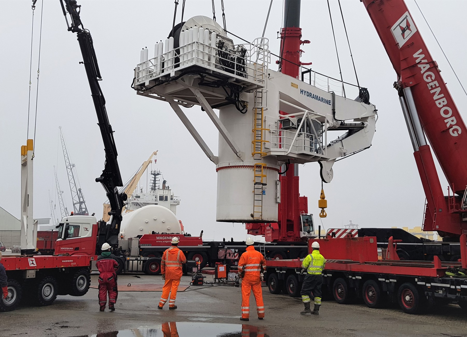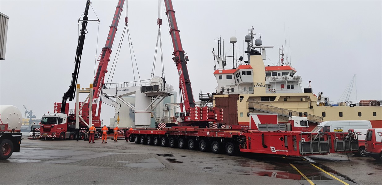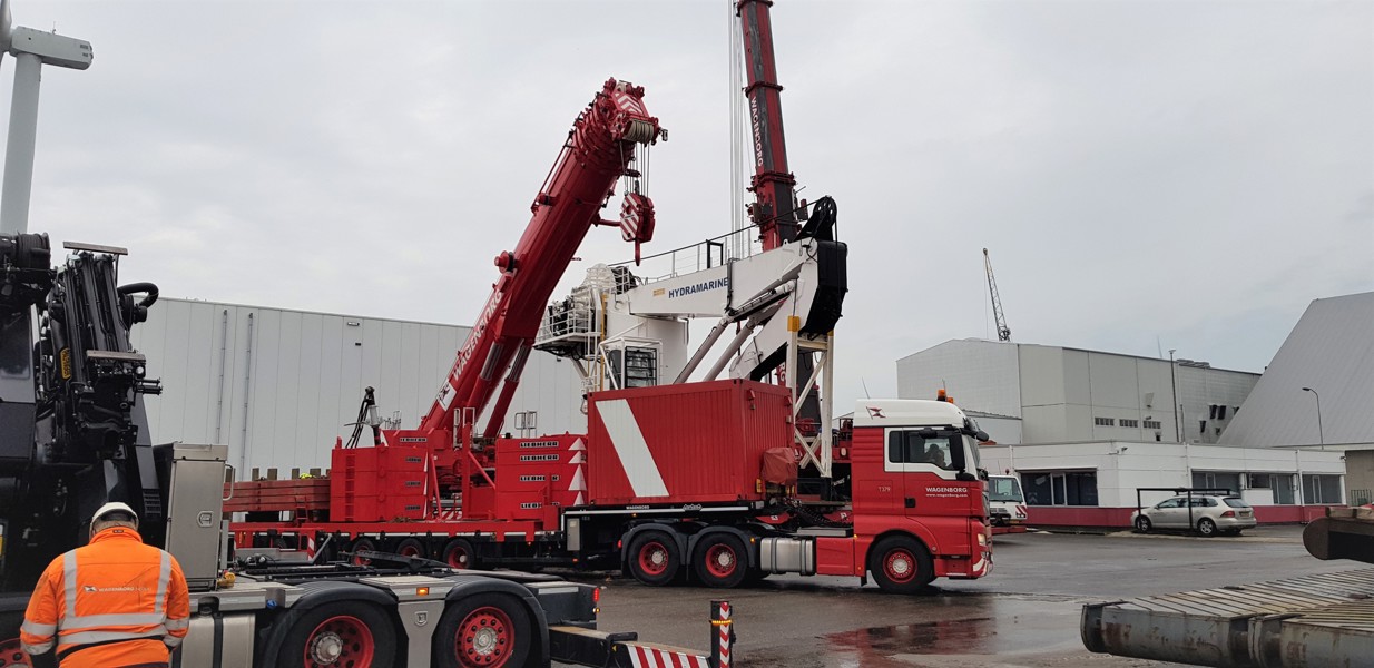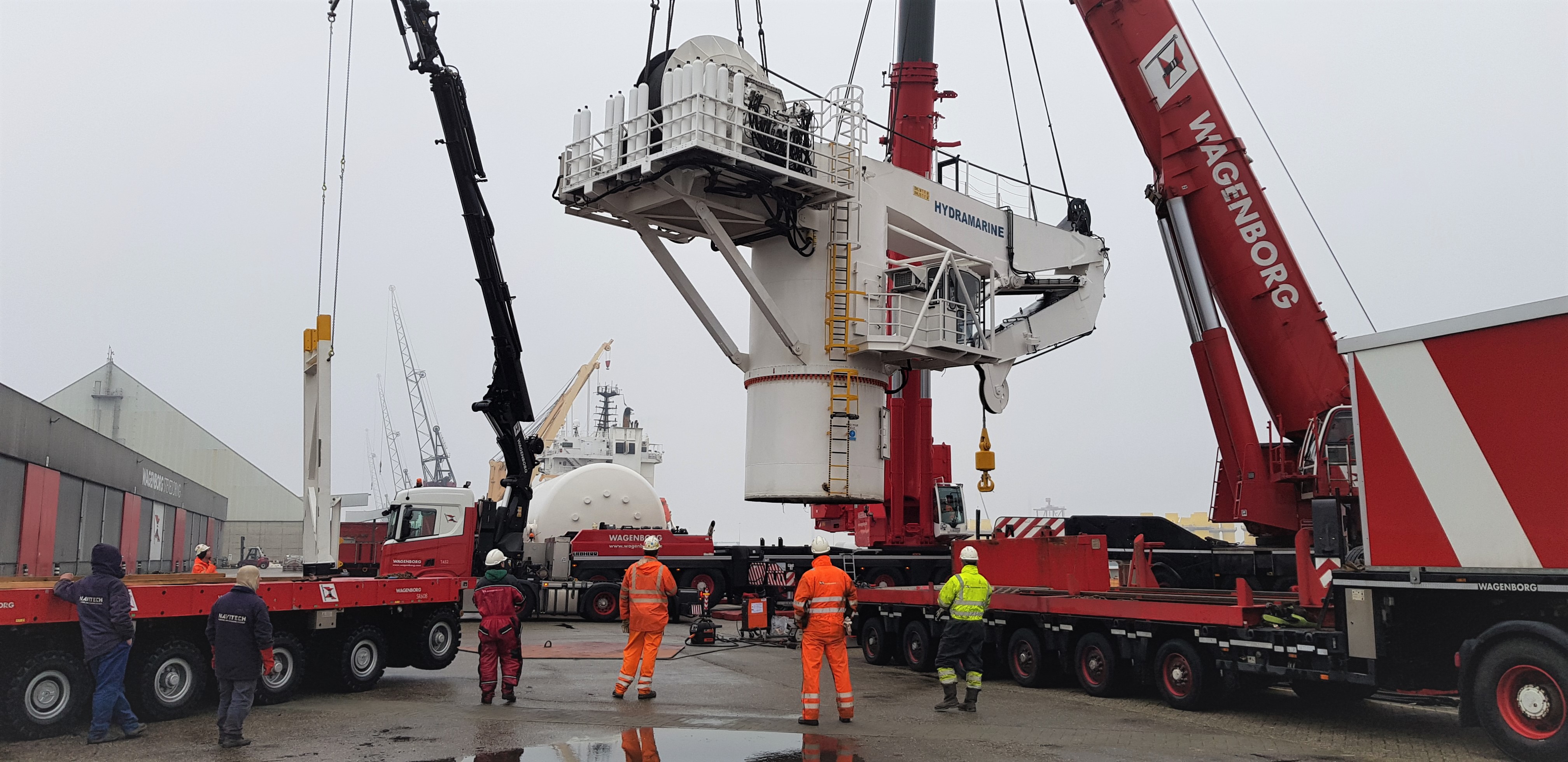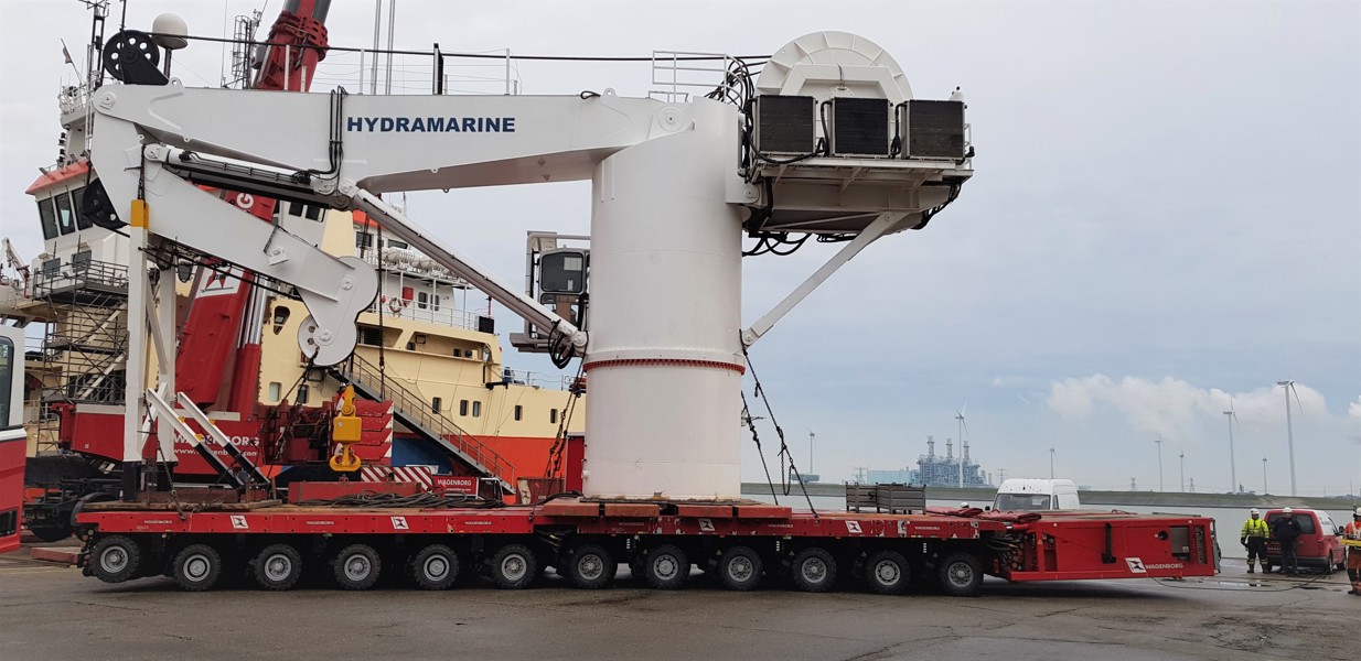 Het team van Wagenborg werd ingeschakeld om het hijs- en transportwerk van de knuckle boom kraan uit te voeren en de opslag te verzorgen.
