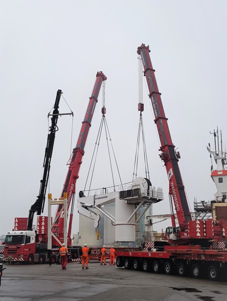 Voor het hijsen van de 135 ton zware kraan zijn Wagenborg Nedlift’s nieuwe 450 tonner Liebherr LTM 1450 en de 500 tonner Demag AC-500 ingezet.