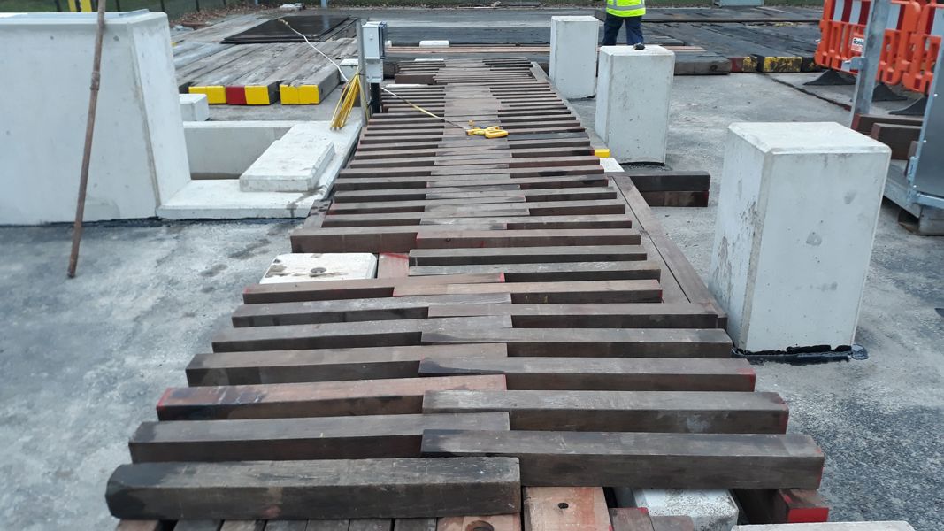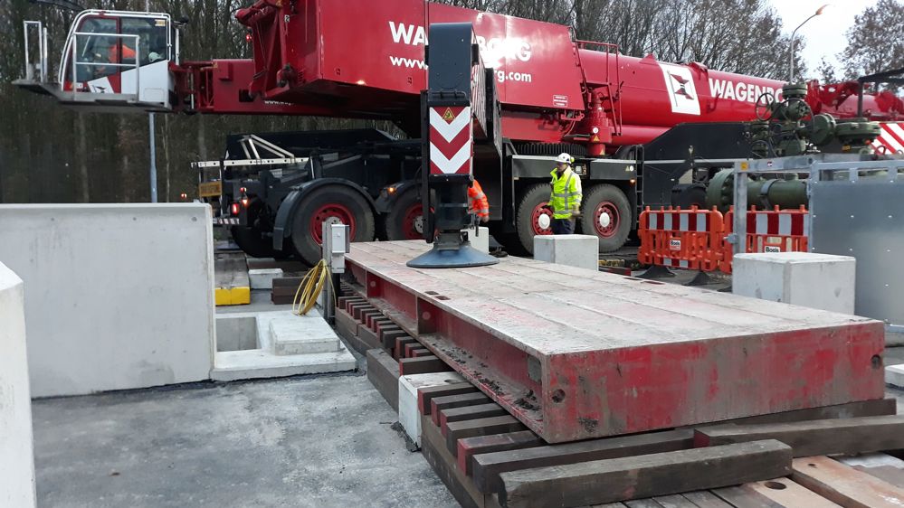 Gelukkig is het team van Wagenborg Nedlift niet voor één gat te vangen en bedachten ze een handige en veilige oplossing voor deze uitdaging. Tussen de betonpoeren werd met behulp van vijzelbalken en draglineschotten een verhoogd plateau van 40 centimeter geconstrueerd.