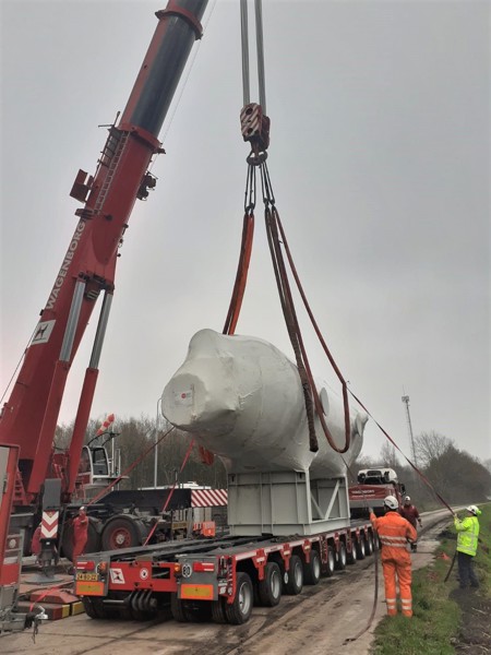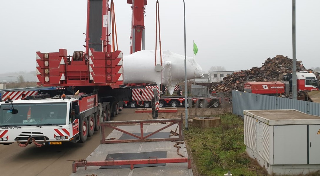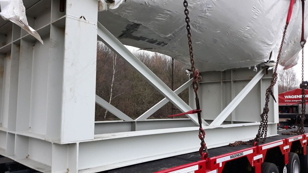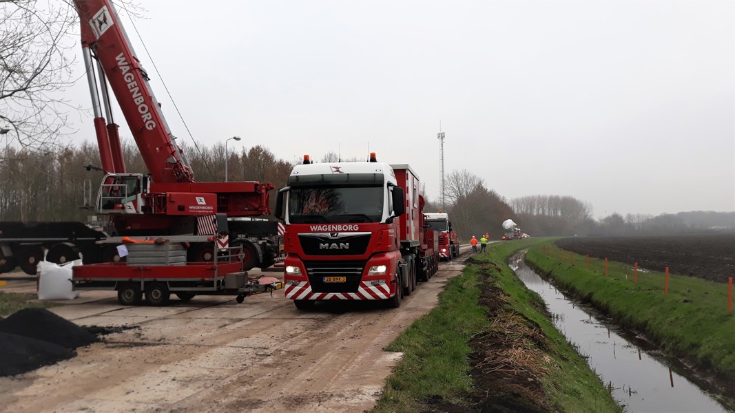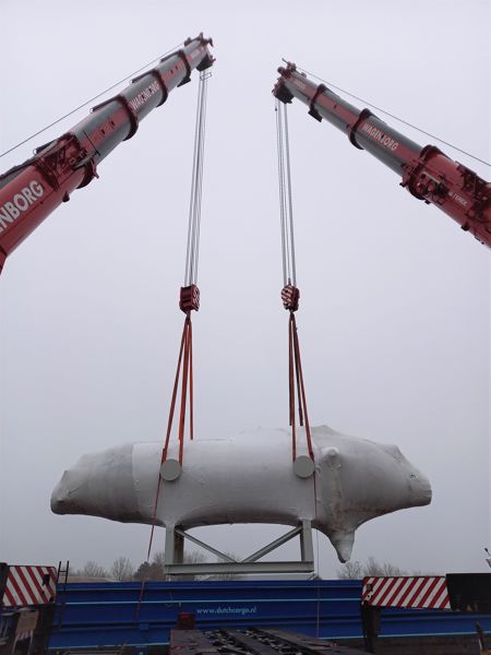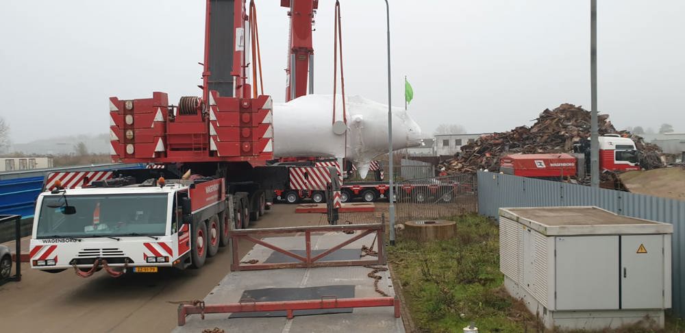 Een mooie kluif voor de hijs- en transportspecialisten van Wagenborg Nedlift, die een plan van aanpak bedachten om het gevaarte vanaf de Renselkade in Winschoten naar de caverne in Heiligerlee te transporteren en aldaar op fundatie te zetten.