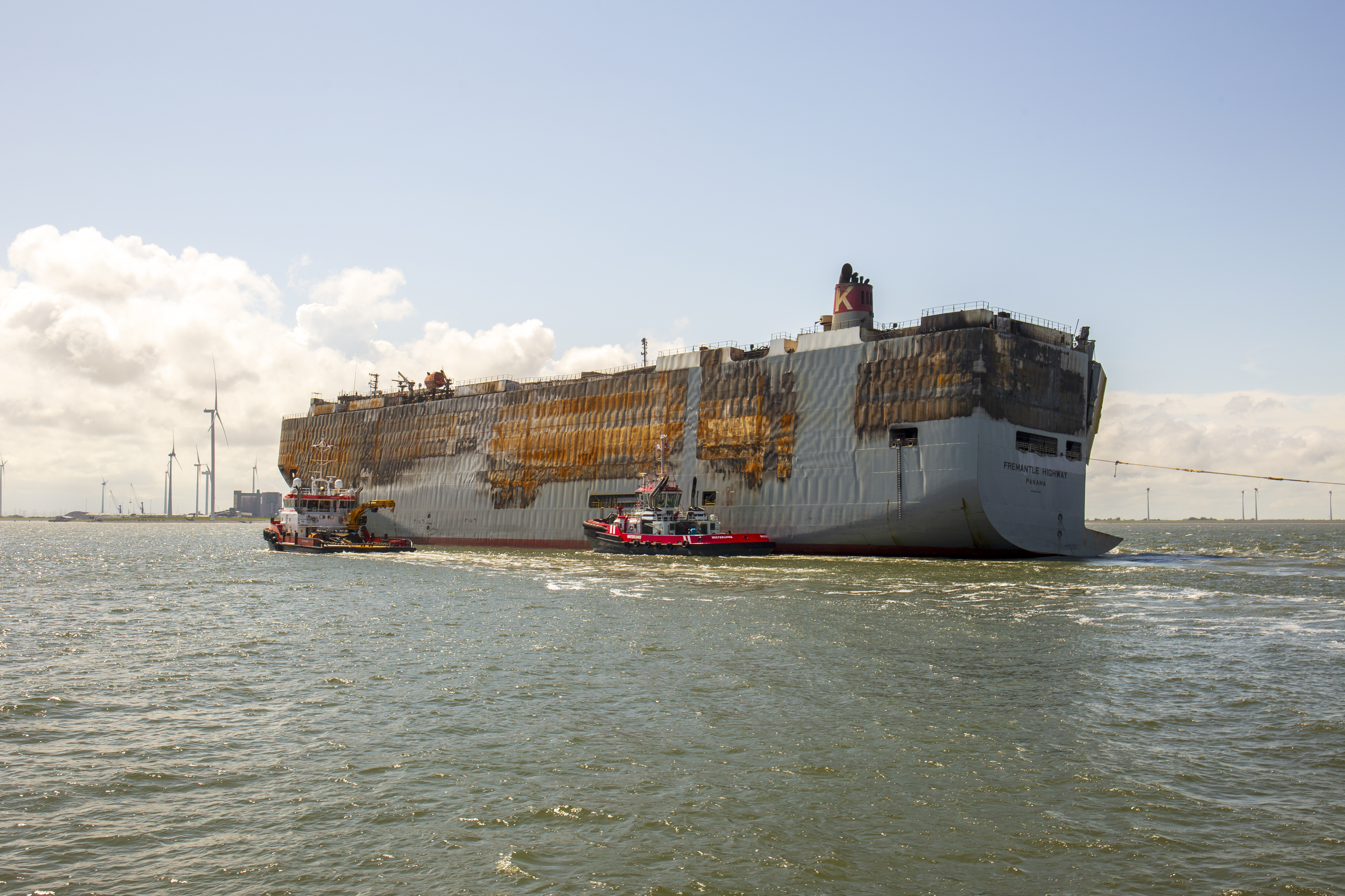 On Thursday, august 3, around 2:30 p.m., the Fremantle Highway arrived safely in Julianahaven in Eemshaven with the assistance of several Wagenborg tugboats, among others. The process went according to plan. Now that the ship is moored at the Wagenborg terminal, the next steps will be determined. This will be discussed by the parties involved in the following days.