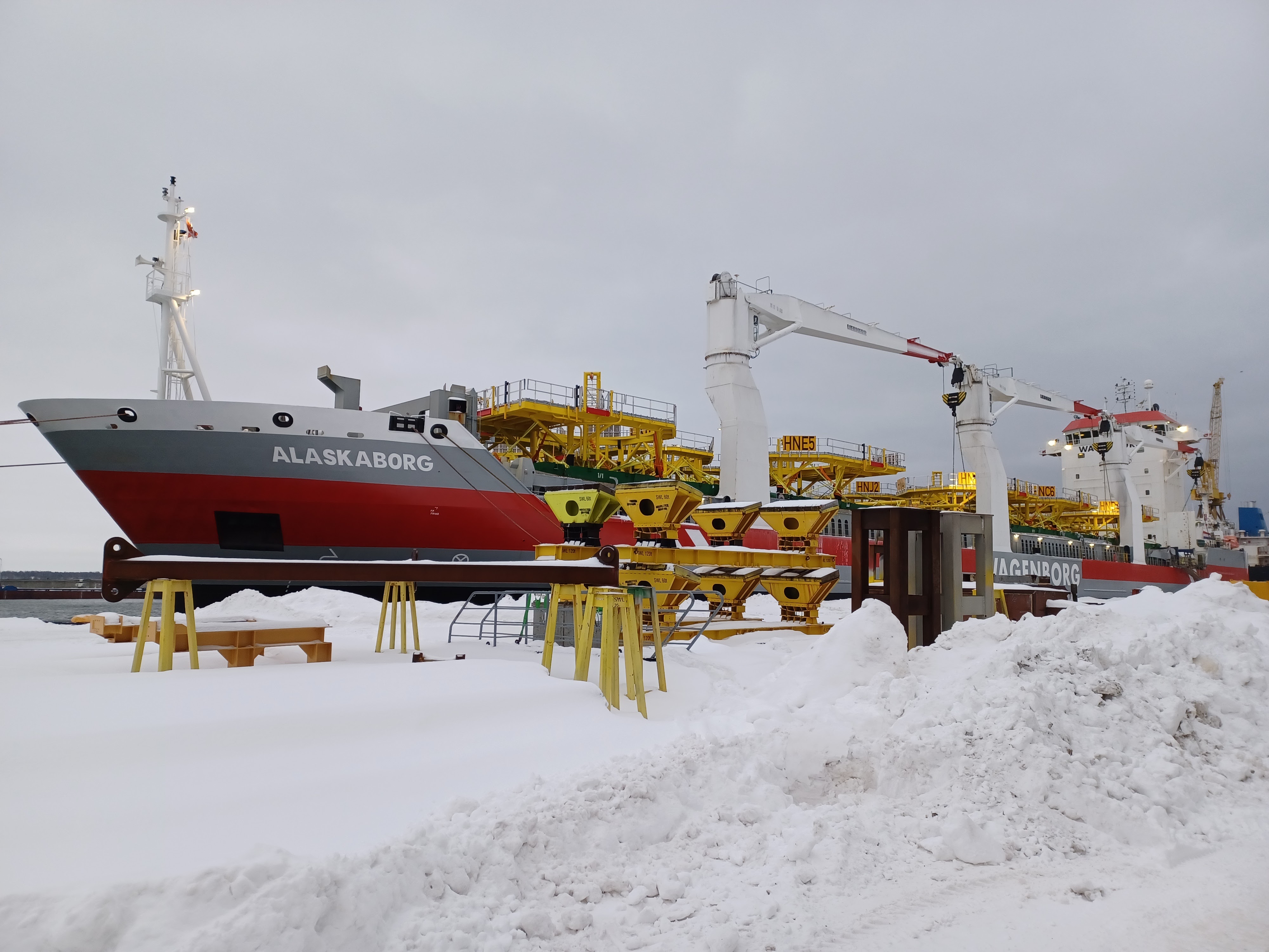 In February 2023, the mv Alaskaborg loaded various wind turbine components in Tallinn for the Netherlands, such as boat landings and access platforms.