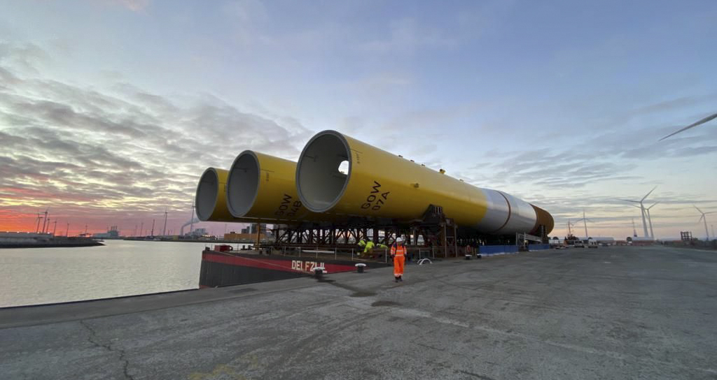 In the upcoming months, Wagenborg will perform another 35 voyages with monopiles from Germany and Denmark to the temporary storage in Eemshaven using a specially equipped pontoon (100 × 33 × 7.6 metres). The ‘WAGENBORG BARGE 8’ is equipped with hydraulically operated saddles and an additional internal ballast system to carry three monopiles per voyage. Wagenborg’s engineers carried out detailed calculations for this method of transport, taking stability, sea conditions and a weight of 1,500 ton per monopile into account.
