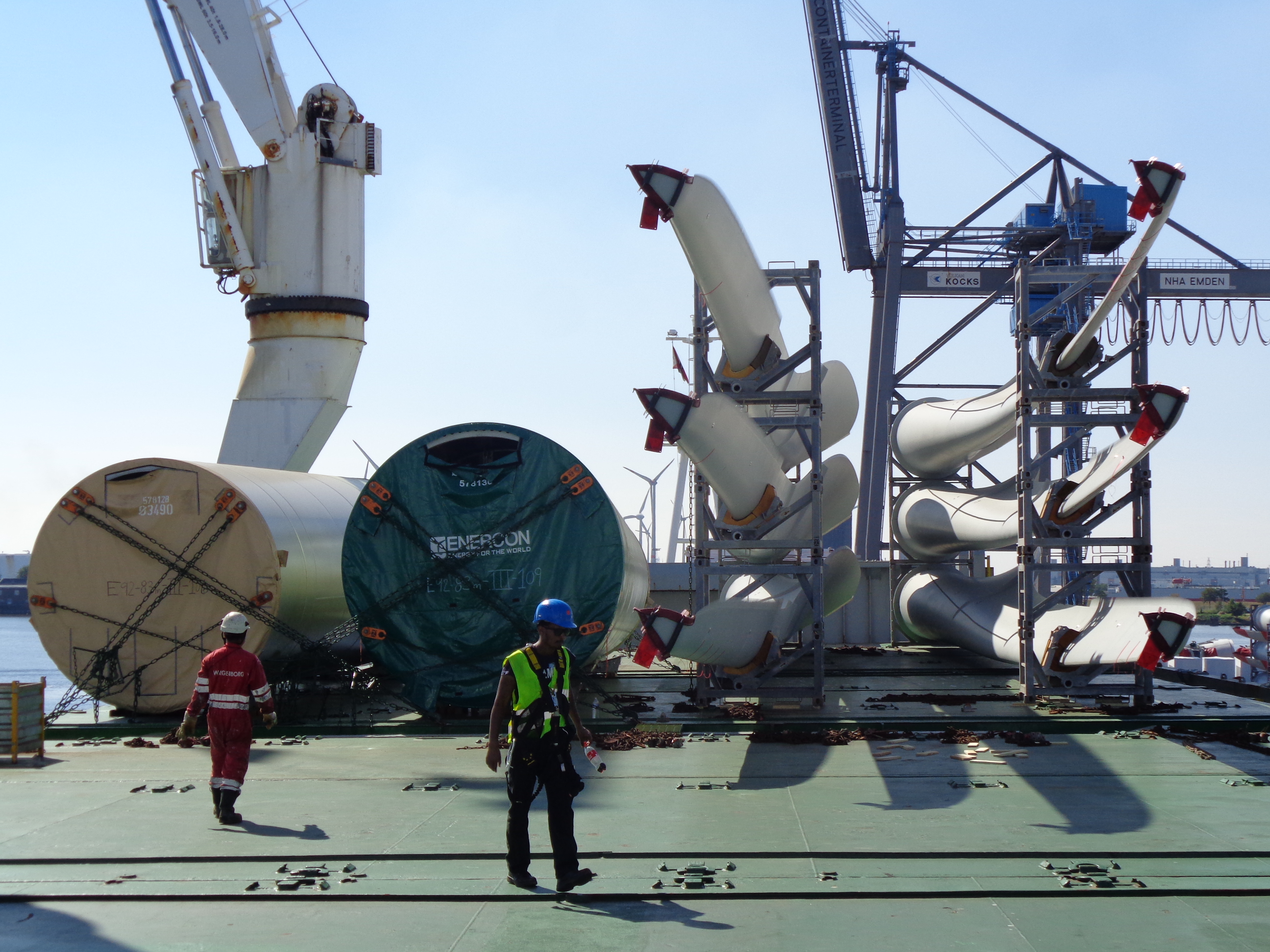 First of all, the Amstelborg was loaded with several wind turbine blades, hubs and nacelles in the German port of Emden. Secondly, in the Swedish port of Landskrona the tower sections were loaded. In total, the Amstelborg carried now five complete wind turbines. Fully loaded, the ice-classed vessel left the European continent for an Atlantic crossing.