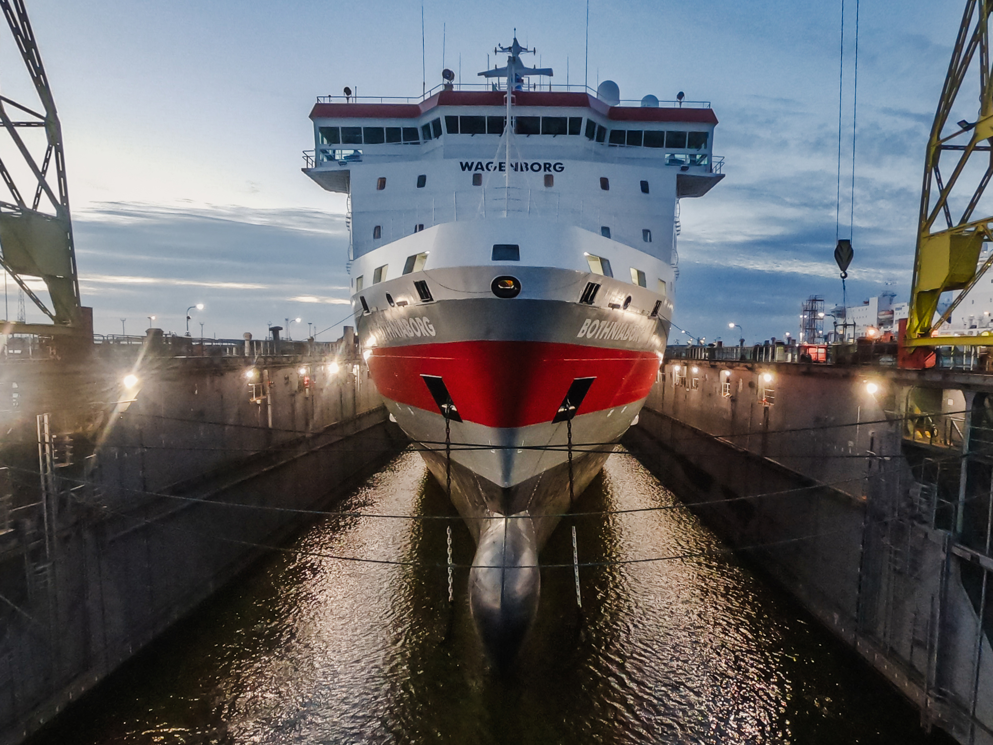 The mv Bothniaborg, built in 2004 at Bodewes Shipyards, was docked at the BLRT shipyards in Klaipeda. Here, the crew, the shipyard, local suppliers and Wagenborg superintendent performed a variety of maintenance and repair works on the 20-year-old vessel.