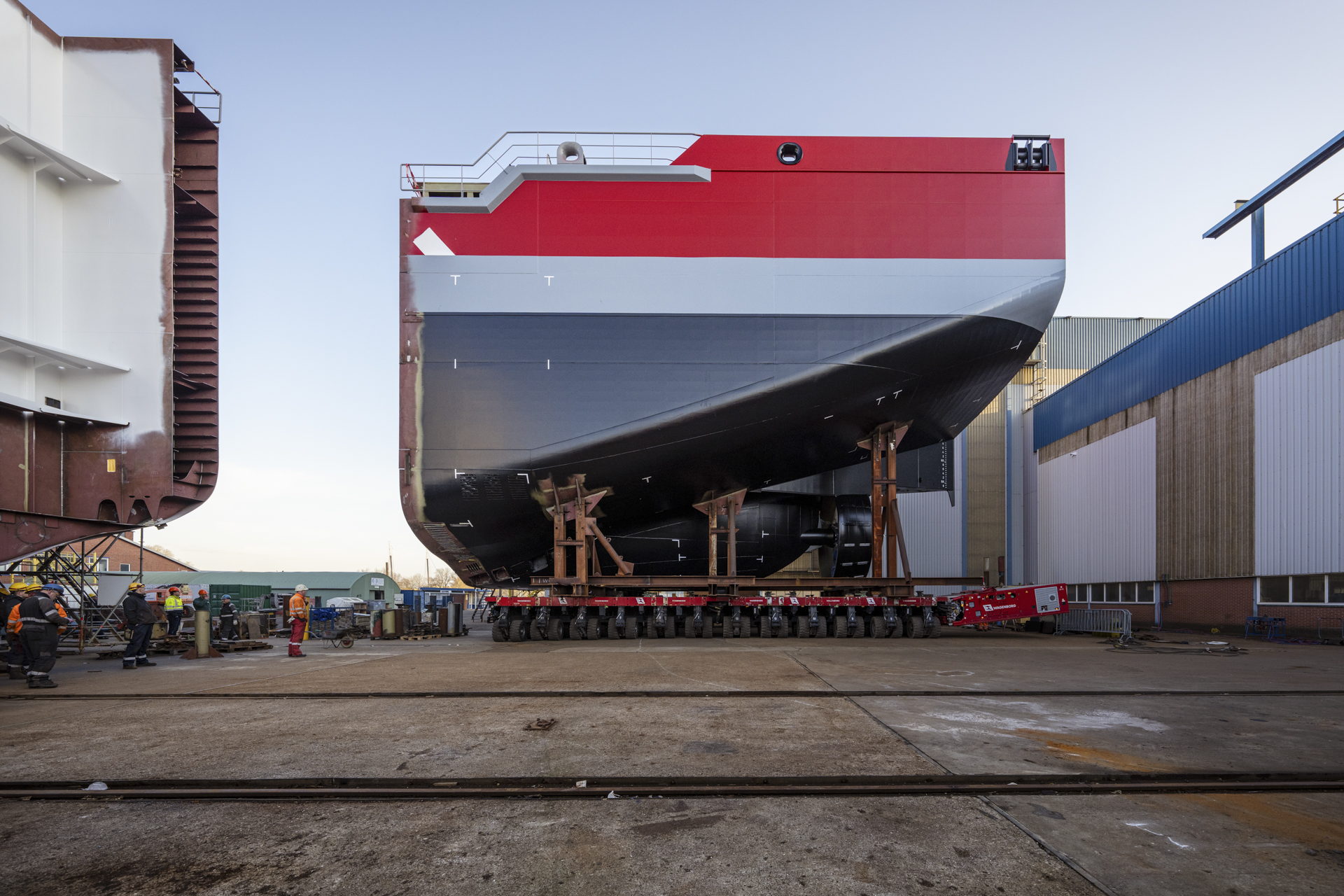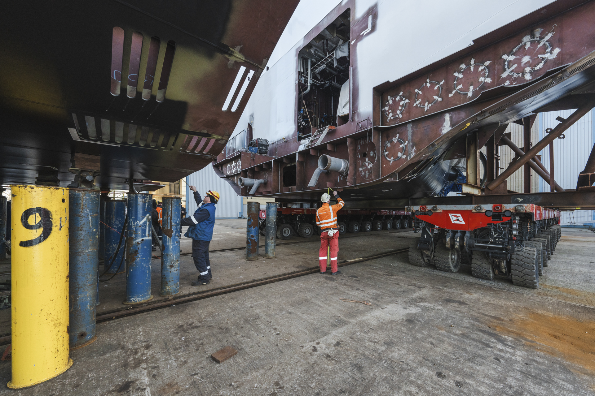 The aft ship, which houses the main engine and other essential systems, was carefully transported by means of Self Propelled Modular Trailers (SPMTs) to the quay side. This operation required precise coordination and expertise, highlighting Wagenborg’s extensive experience in heavy transport and shipbuilding logistics.