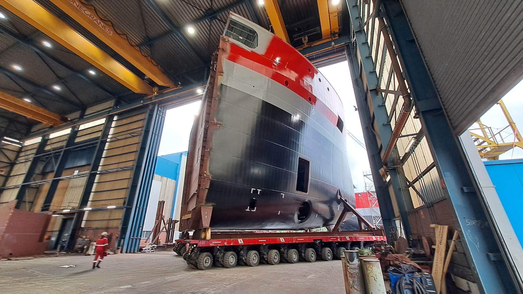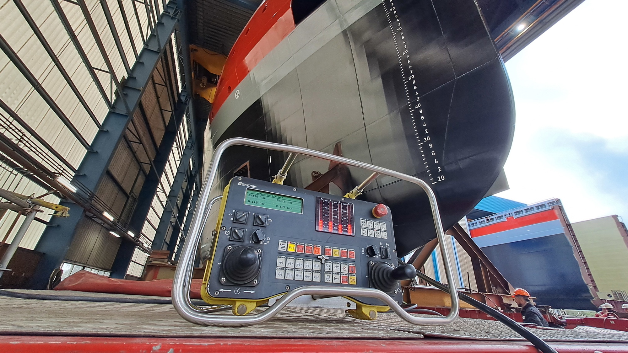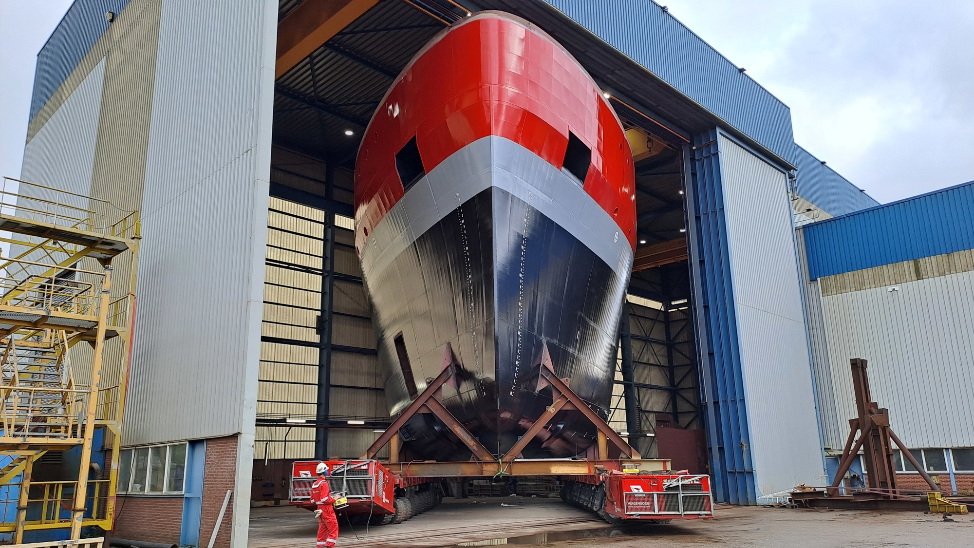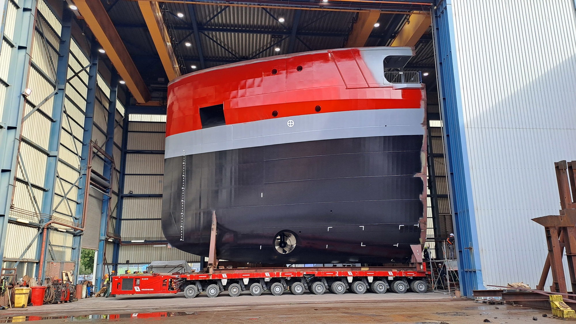Before transporting the fore ship, the shipbuilding experts at Niestern Sander and their subcontractors installed as many systems, pipes, and machinery as possible within the construction halls at the shipyard. Additionally, the front section of the new EasyMax vessel was fully preserved and painted in the recognizable Wagenborg colors.