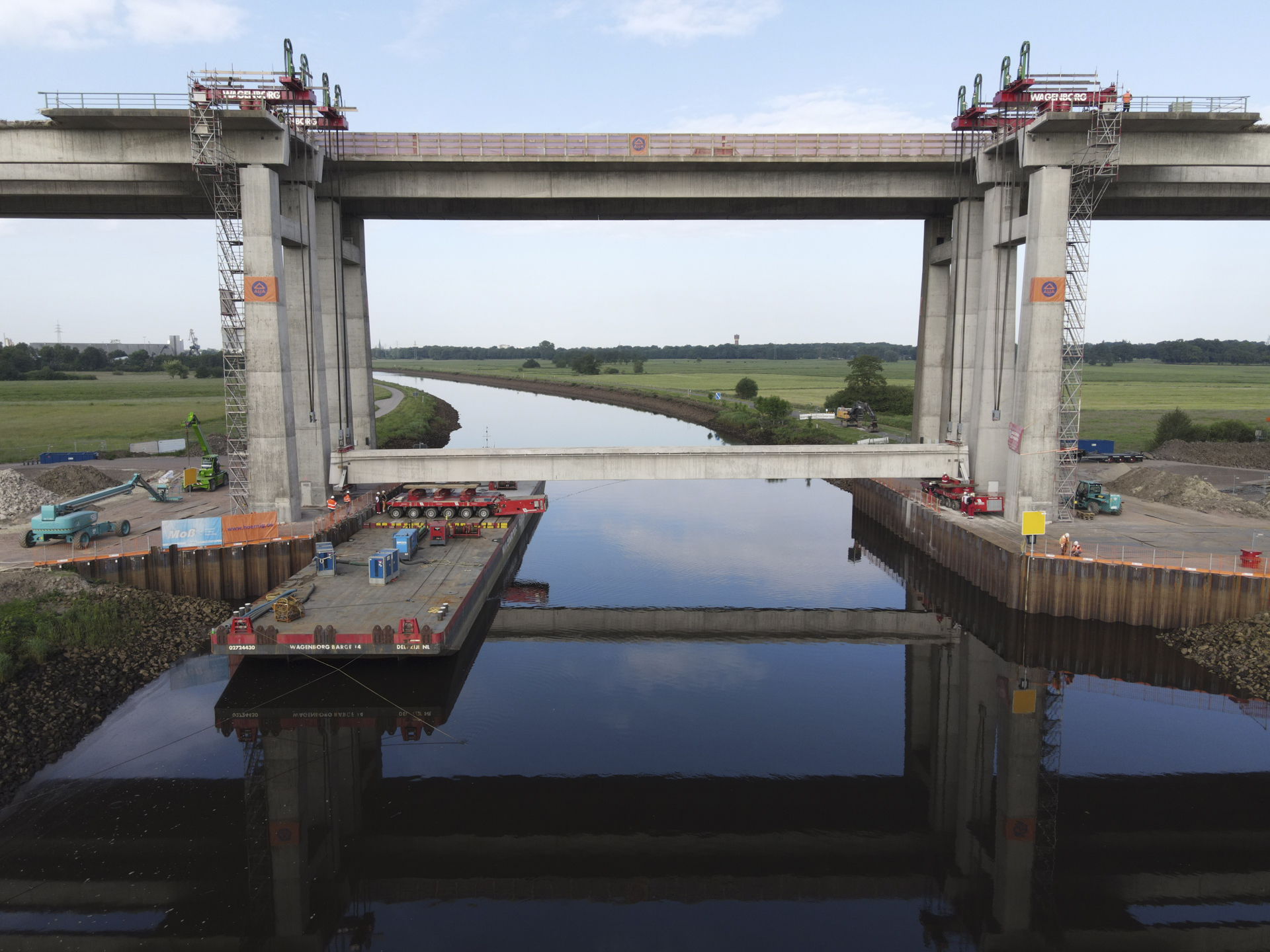 Both girders had a weight of 350 tons and measure more than 50 meters in length. To lower these units safely, the engineering department of Wagenborg came up with a innovative solution combining the lifting and heavy transport expertise of Wagenborg Nedlift and the towage and barge experience of Wagenborg Towage.