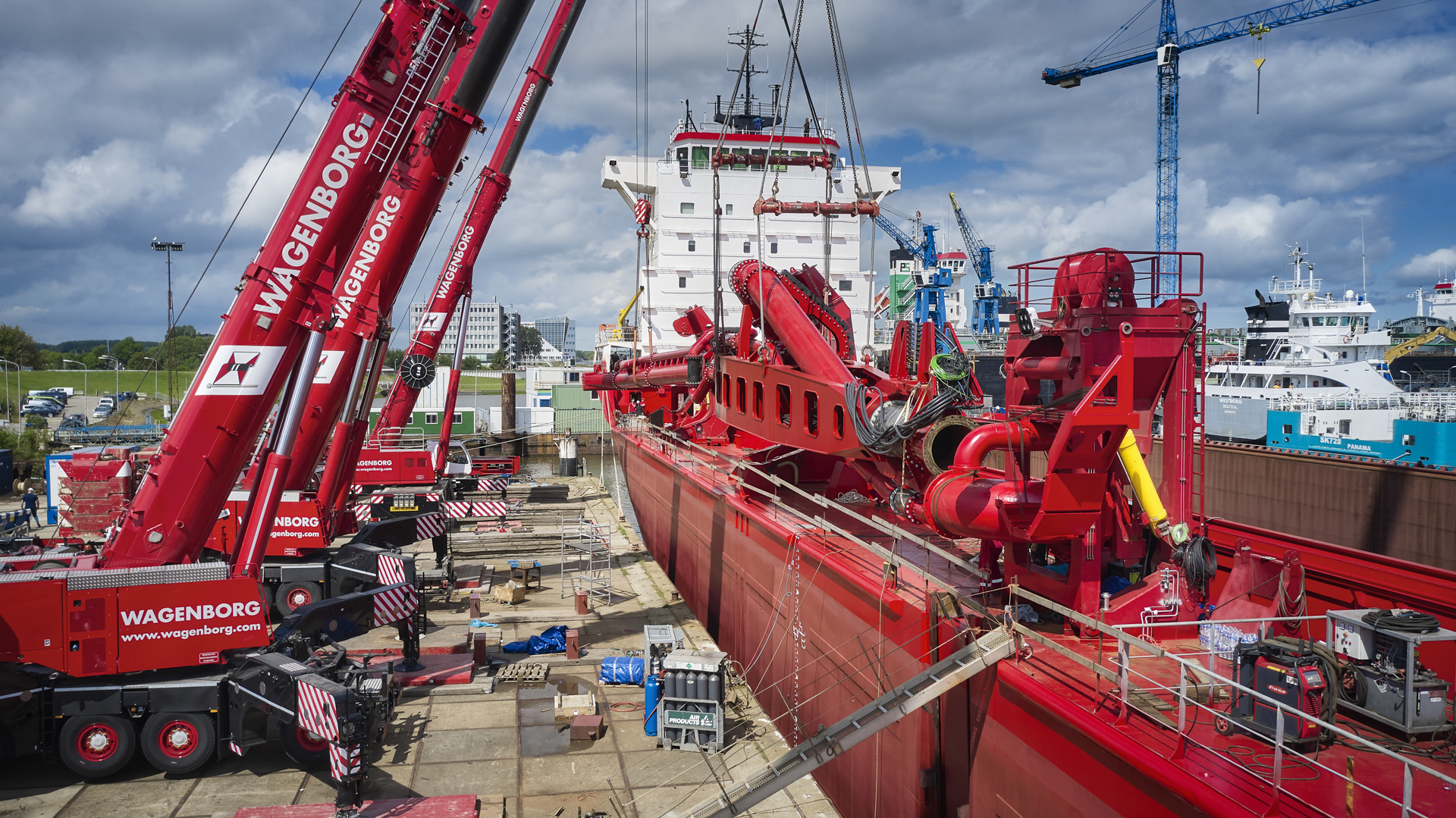 For several weeks, the MV Yed Prior has been docked at the Royal Niestern Sander shipyard in Delfzijl for a conversion. This ship is being converted from a container ship to a gravel dredger for the fa. Spaansen. In April, work started with that can only be done when the ship is dry.