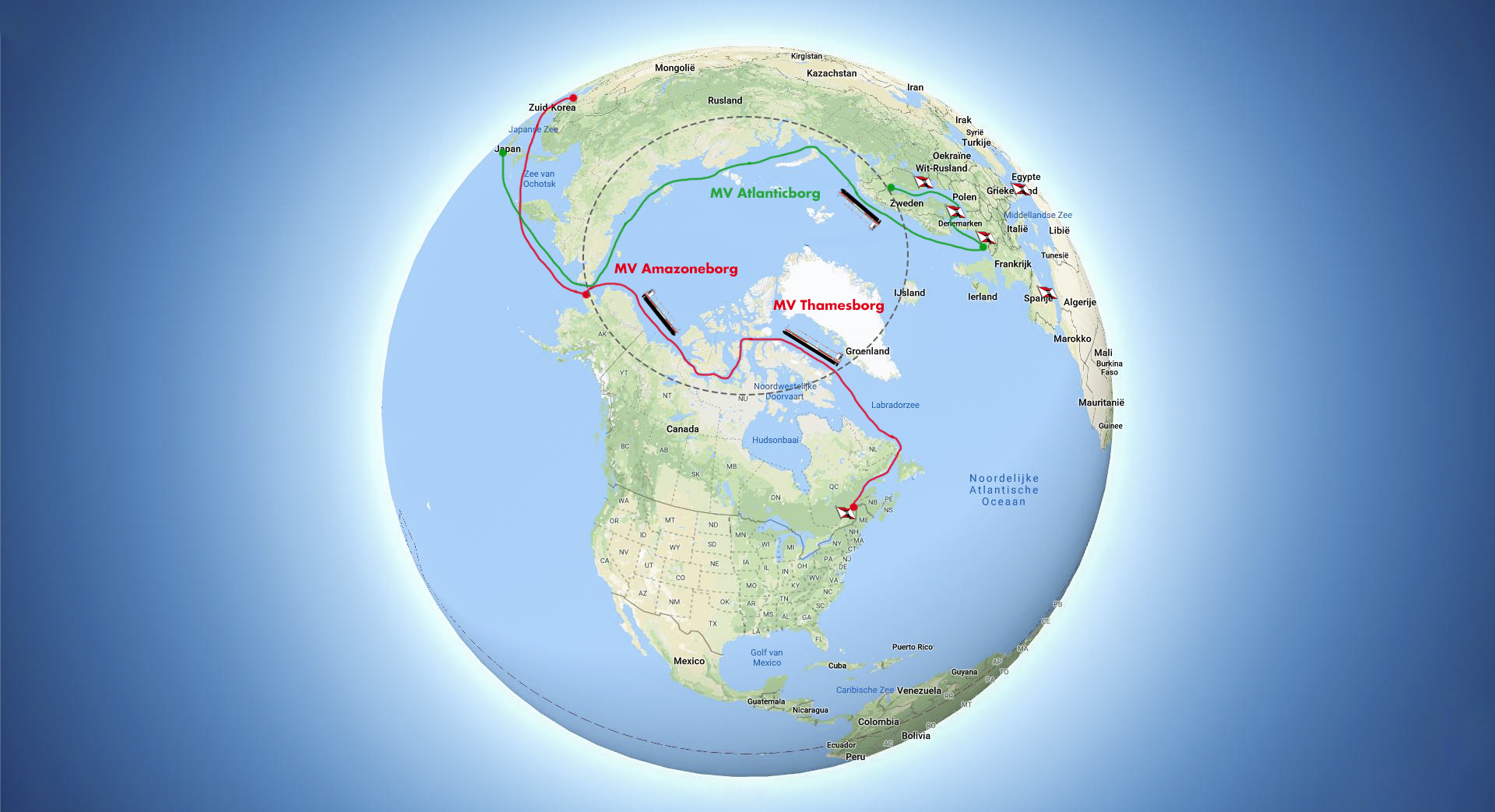 The MV Amazoneborg travelled from China to Canada via the Northwest Passage, while the MV Thamesborg sailed the exact opposite route from Canada to China. The route between China and Canada through the Northwest Passage is some 3750 nautical miles shorter than the traditional route via the Panama Canal, resulting in about 14 days less sailing and thus a reduction in emissions of over 40%. In 2016, Wagenborg was the first European shipping company to traverse the entire North West Passage without the assistance of icebreakers.